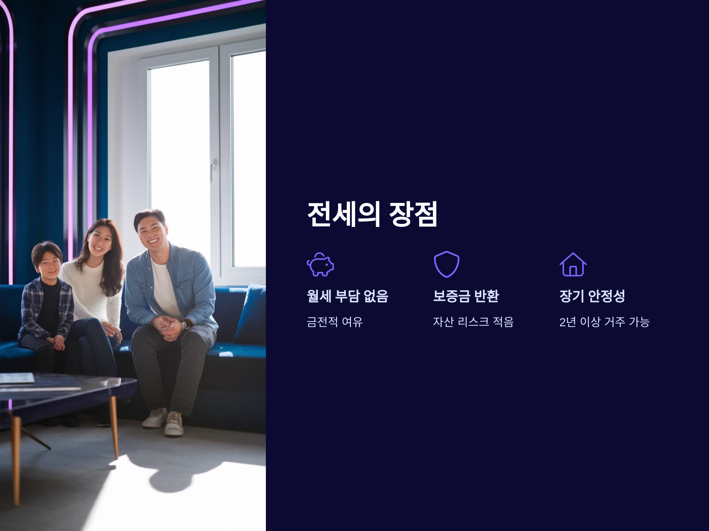 - 장기적인 안정성: 전세는 대부분 2년 이상의 계약 기간을 설정할 수 있어, 장기간 안정적인 거주가 가능합니다.