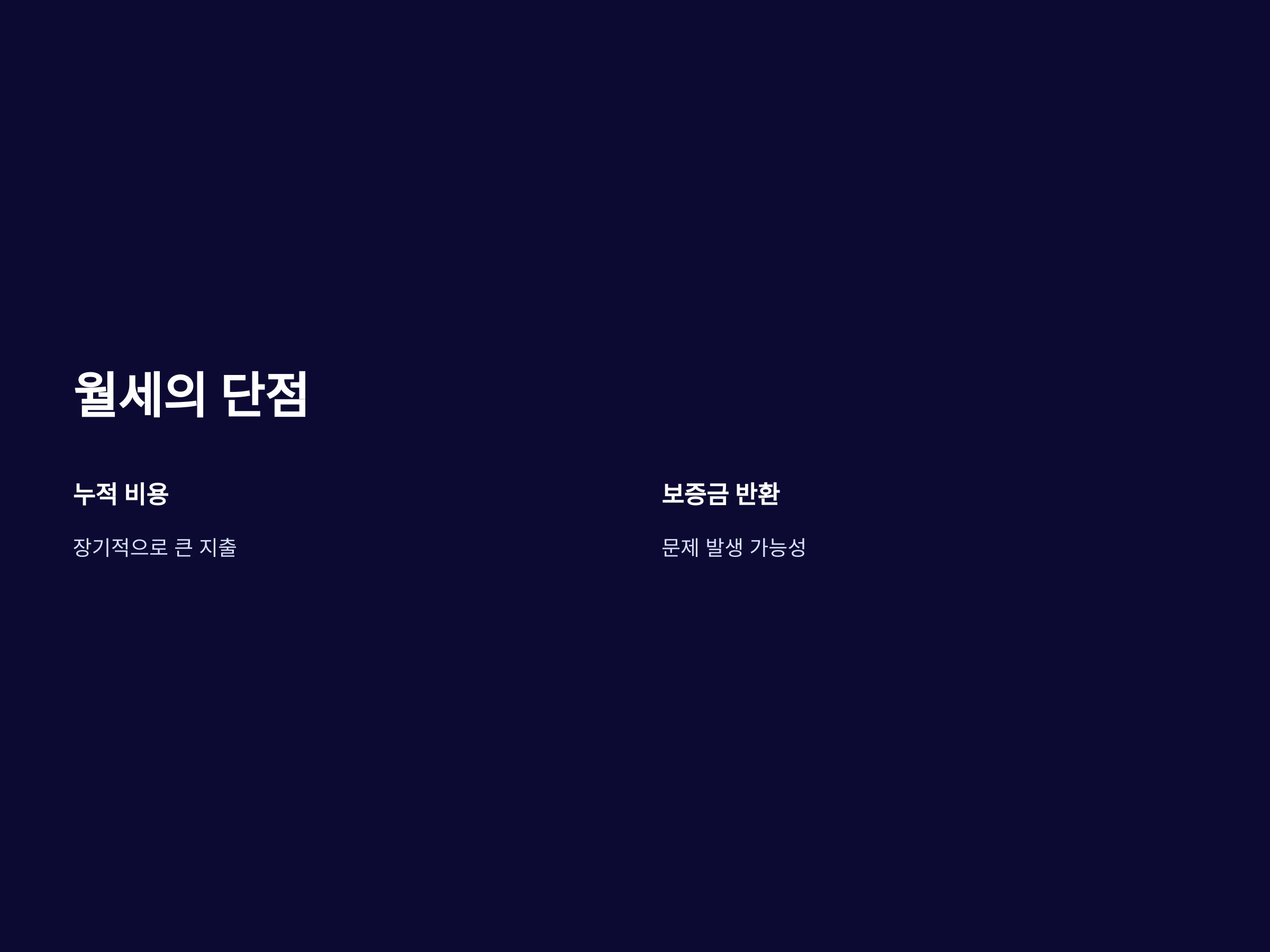 - 보증금 반환 문제: 월세는 보증금이 적지만, 계약 종료 후 보증금을 돌려받는 과정에서 다소 시간이 걸릴 수 있으며, 일부 집주인과의 문제로 인해 반환에 어려움을 겪을 수 있습니다.