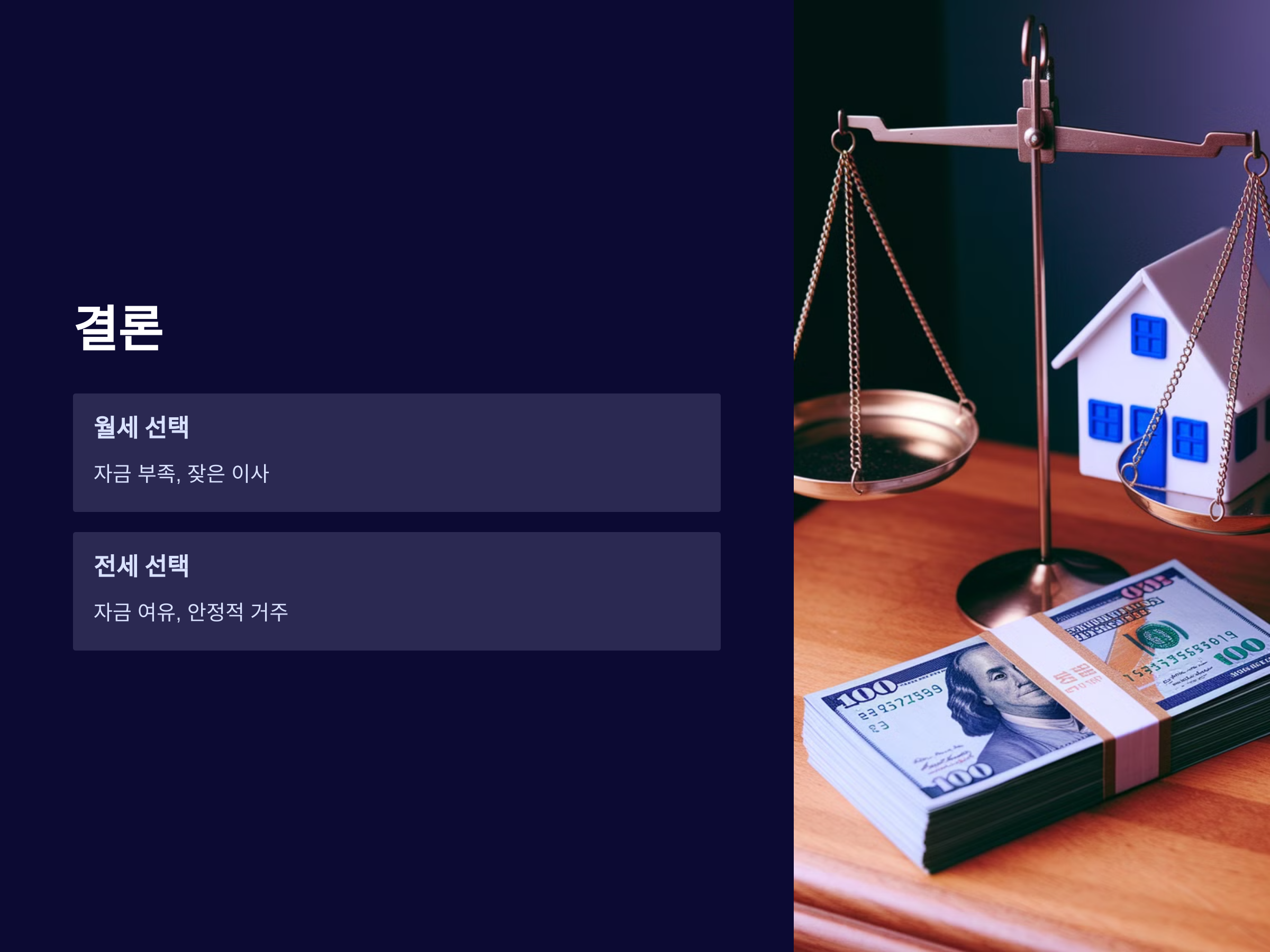 월세와 전세는 각기 다른 장단점이 있으며, 무엇이 더 유리한지는 개인의 재정 상황과 거주 계획에 따라 달라집니다. 자금이 부족하거나 자주 이사를 계획하는 사람은 월세를, 자금 여유가 있고 안정적인 거주를 원한다면 전세를 고려하는 것이 좋습니다. 중요한 것은 자신의 라이프스타일과 장기적인 계획을 고려한 선택을 하는 것입니다.