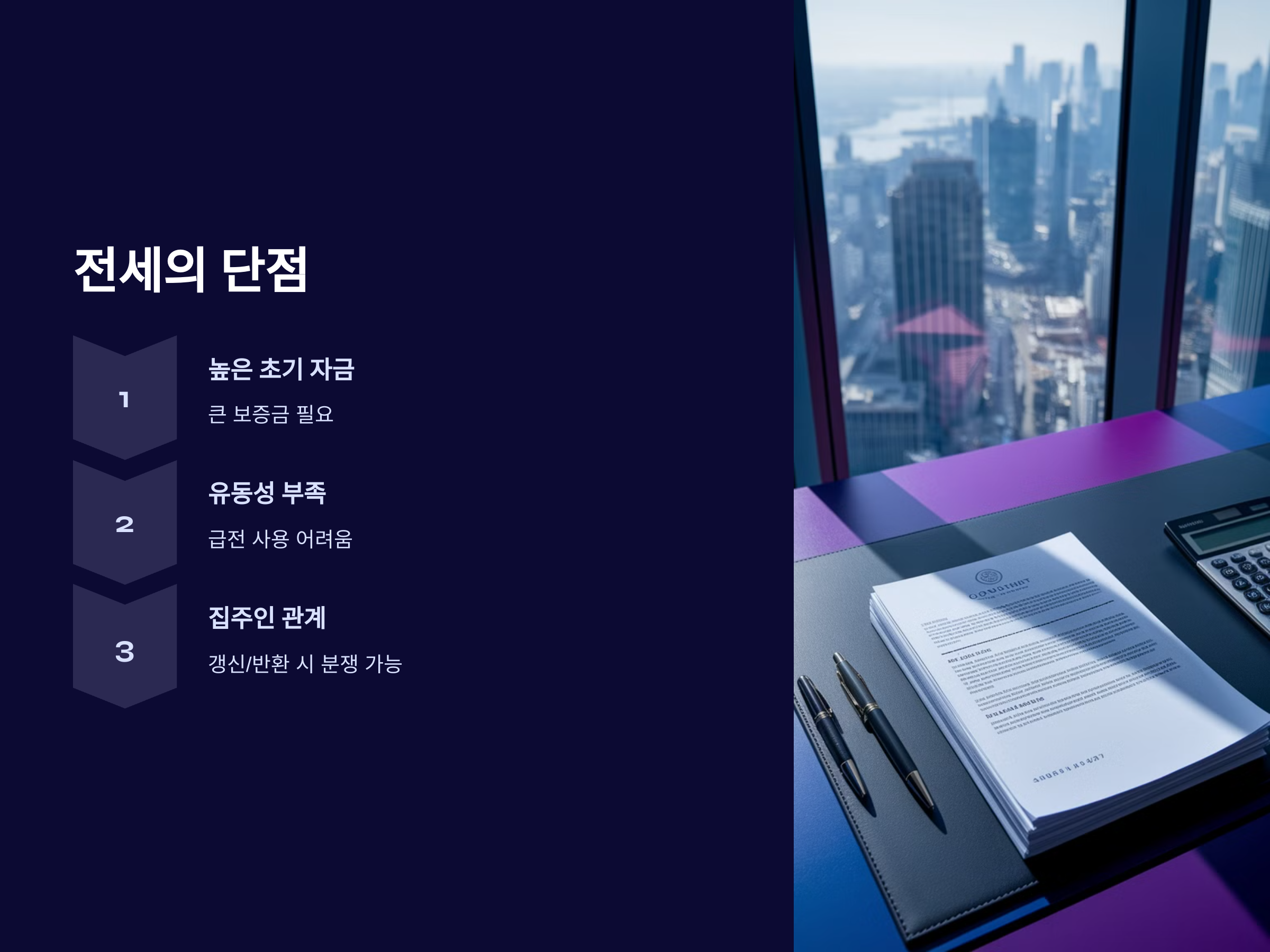 - 자금의 유동성 부족: 전세금은 계약 종료 시까지 집주인에게 묶여 있기 때문에, 급전이 필요할 때 전세금을 찾는 것이 어려울 수 있습니다.