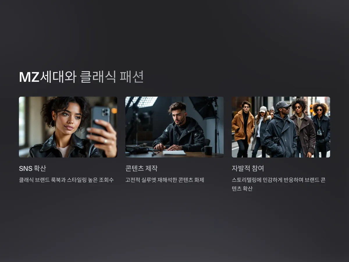 또한, 코로나19 팬데믹 이후 사람들은 삶의 가치관에 대해 다시금 생각하게 되었고, 이에 따라 ‘변하지 않는 것’에 대한 선호가 높아졌습니다. 이 과정에서 클래식 디자인은 고전미, 절제된 아름다움, 장인의 정성을 담은 아이템으로 각인되며 신뢰를 얻고 있습니다. 특히 30~40대 소비자들은 단순히 유행을 따라가기보다는 자신의 취향과 가치에 맞는 옷을 고르는데, 이들에게 클래식 패션은 훌륭한 선택지가 됩니다.
