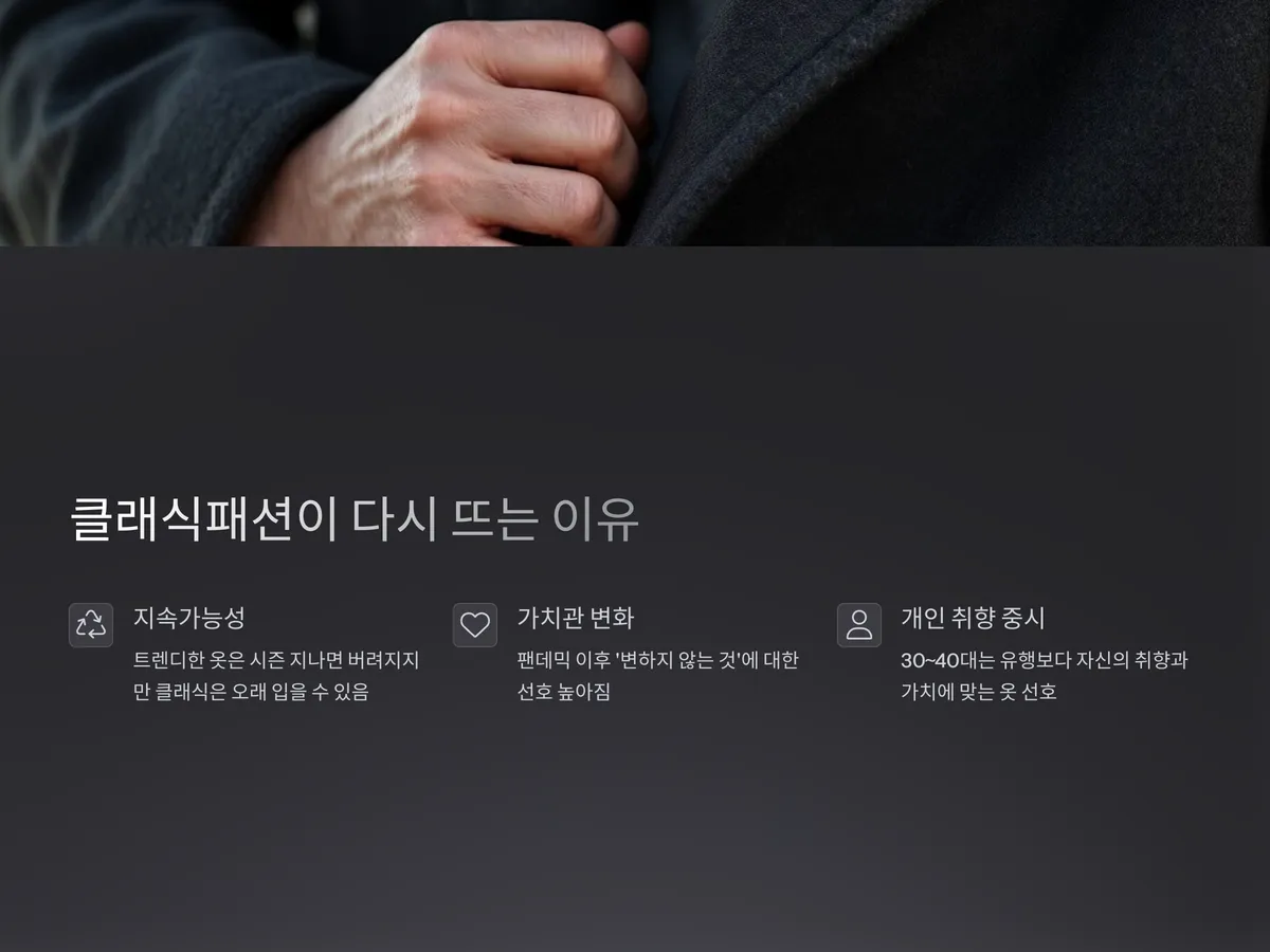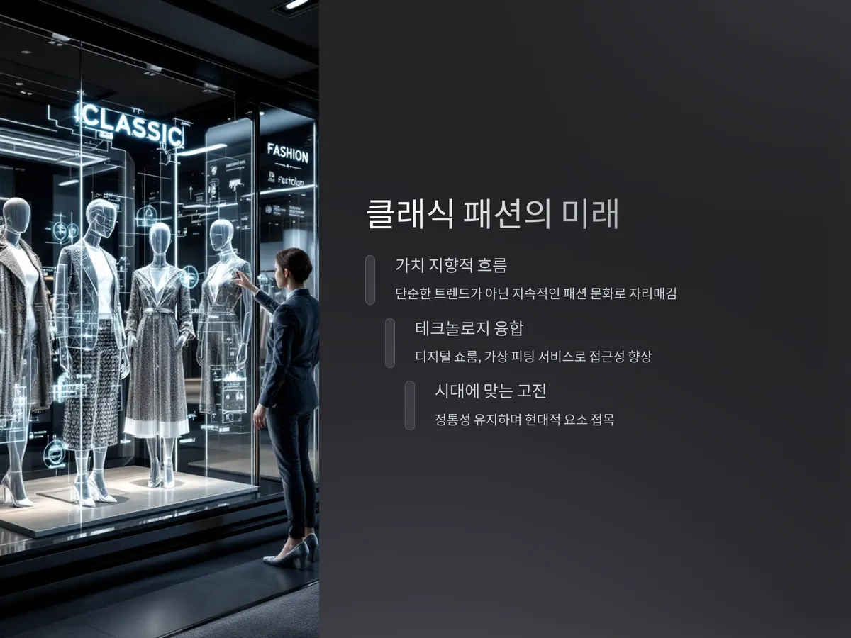 클래식 패션의 인기는 단순한 일시적인 트렌드가 아닌, 하나의 '가치 지향적 흐름'입니다. 기술과 AI, 디지털 패션이 발전하는 시대일수록, 사람들은 오히려 '사람의 손'이 느껴지는 클래식한 품질에 감동을 받습니다. 이는 AI와 패션이 융합된 현재에도 인간적인 가치가 여전히 중요하다는 증거이기도 합니다.