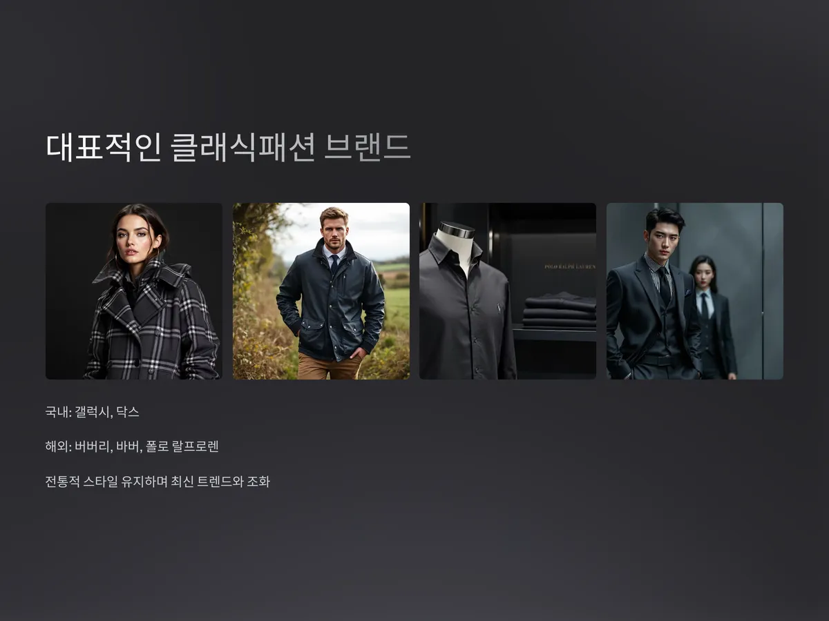 클래식 패션을 대표하는 브랜드는 세계적으로 다양합니다. 국내에서는 헤리티지 브랜드인 ‘갤럭시’, ‘닥스’가 꾸준한 사랑을 받고 있으며, 해외 브랜드로는 ‘버버리’, ‘바버’, ‘폴로 랄프로렌’ 등이 있습니다. 이들 브랜드는 전통적인 스타일을 유지하면서도 최신 트렌드와 조화롭게 어우러지는 제품을 출시해 젊은 세대의 관심도 끌고 있습니다.