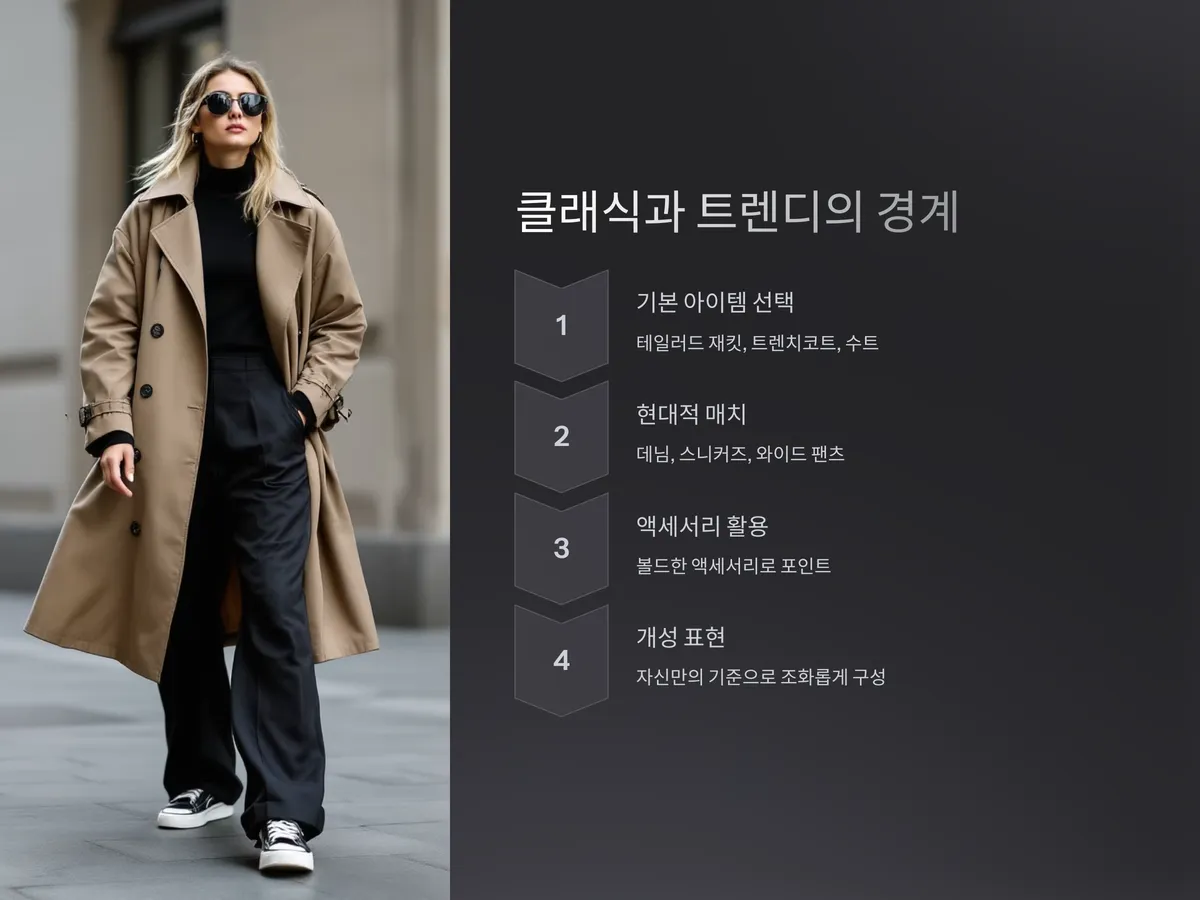 클래식 패션이라고 해서 올드하거나 고루한 스타일만 고집할 필요는 없습니다. 오히려 요즘은 클래식 아이템을 어떻게 ‘지금’의 방식으로 재해석하느냐가 관건입니다. 예를 들어, 기본 테일러드 재킷에 데님을 매치하거나, 클래식한 블레이저에 러프한 스니커즈를 매치하는 방식 등 트렌디한 감성을 자연스럽게 녹이는 것이 포인트입니다.