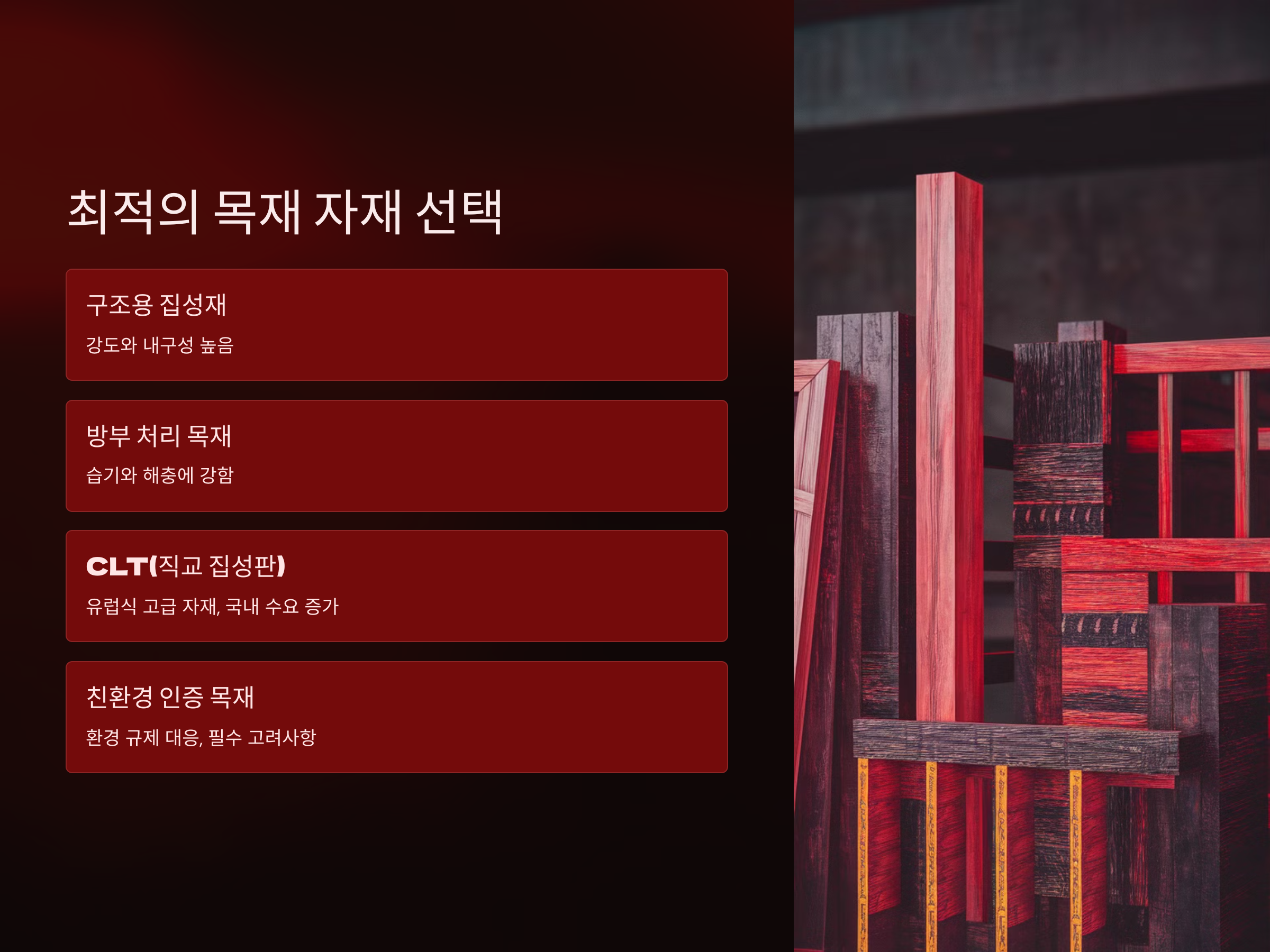 자재 선택 시 가장 중요한 점은 환경과의 조화입니다. 한국처럼 장마철이 긴 지역은 방수, 방습 기능이 강화된 자재를 사용해야 오래도록 튼튼하게 유지할 수 있습니다. 또한, 친환경 인증을 받은 목재 사용이 필수화되는 분위기이므로, 이를 고려한 자재 선택이 중요합니다.