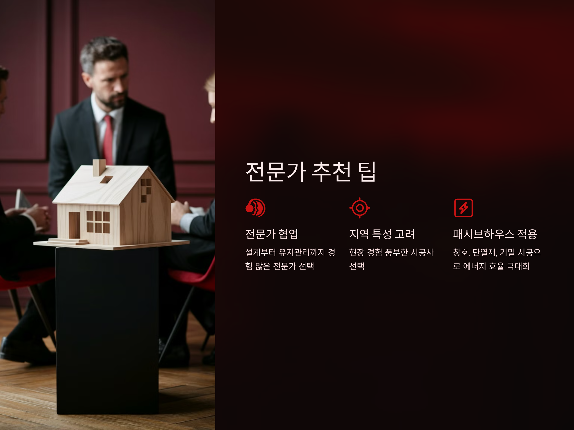 성공적인 목조 전원주택 시공을 위해서는 경험 많은 전문가와 협업하는 것이 가장 중요합니다. 설계부터 자재 선택, 시공 과정, 유지관리까지 전문성이 필요한 부분이 많기 때문입니다. 특히 현장 경험이 풍부한 시공사는 지역 특성에 맞는 해결책을 제시할 수 있어 매우 유리합니다.