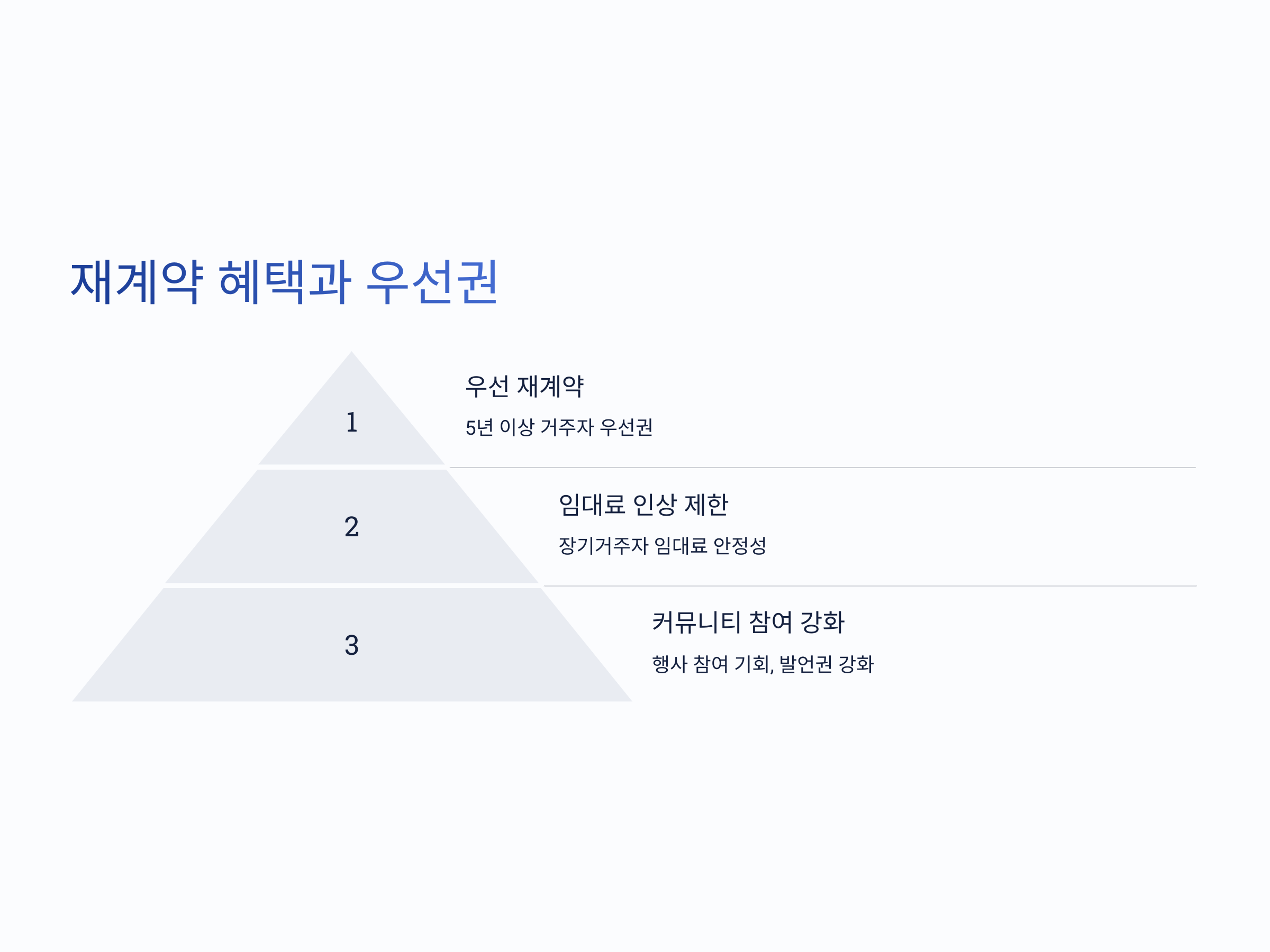 청년주택 장기거주자는 재계약 시 우선권을 가집니다. 보통 일반적인 임대차 계약에서는 재계약이 보장되지 않지만, 청년주택의 경우 5년 이상 거주자는 재계약 우선권과 임대료 인상 제한이 적용됩니다. 특히 신혼부부나 사회초년생으로 생활 안정성을 찾는 이들에게는 더할 나위 없는 혜택입니다. 또한 커뮤니티 행사 참여 기회, 입주민 회의 발언권 강화 등 생활 만족도를 높이는 다양한 프로그램 우선 참여 혜택도 주어집니다.