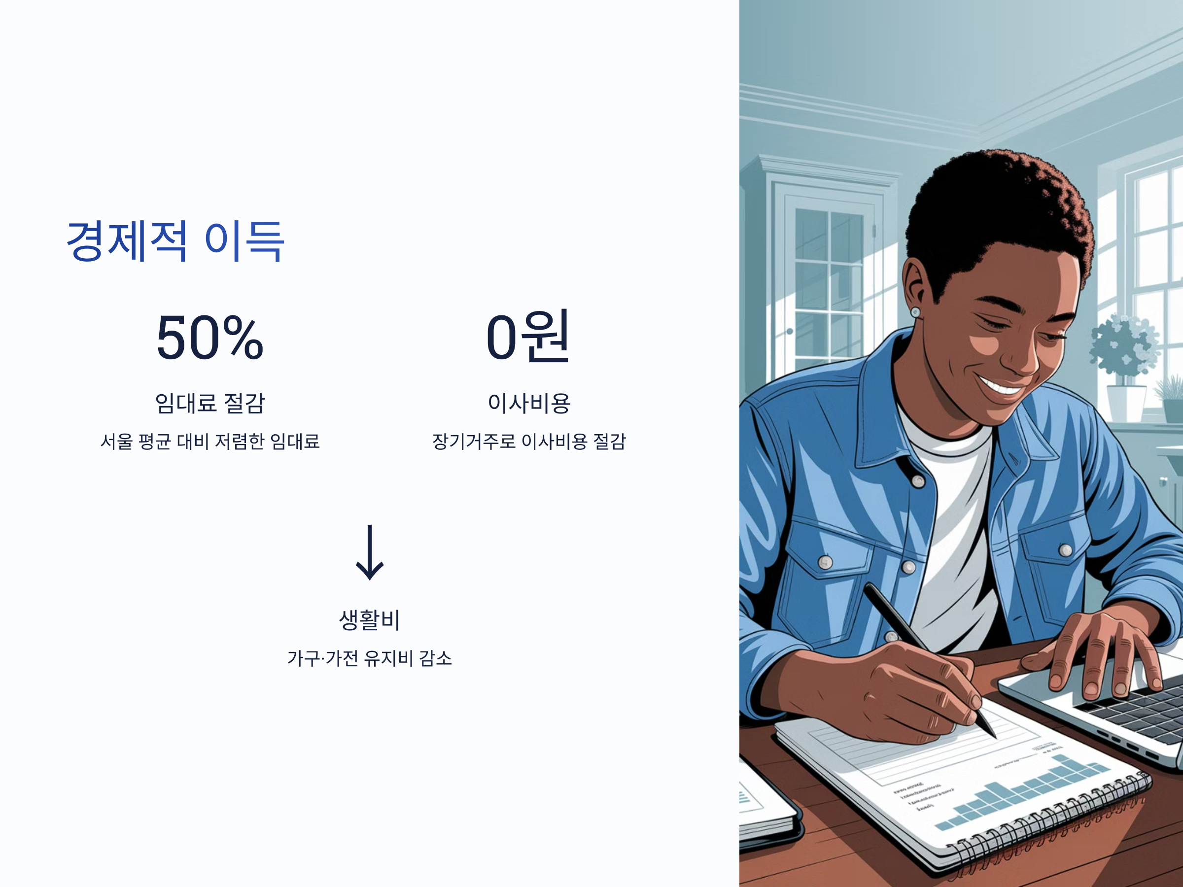 장기거주 최대 장점 중 하나는 경제적 절약입니다. 서울의 평균 전월세와 비교했을 때 청년주택의 임대료는 약 30~50% 저렴합니다. 여기에 장기거주자 대상 공공기관 연계 지원금을 받게 되면 월 임대료 부담이 크게 줄어듭니다. 또한 장기거주자는 이사 비용 절감, 가구·가전 유지비 감소, 생활비 절약 등의 효과도 큽니다. 특히 일부 청년주택에서는 장기거주자를 대상으로 생활비 보조금 지급을 확대하거나, 매년 일정 금액의 문화비 지원 혜택도 제공하고 있어 경제적 여유를 더할 수 있습니다.
