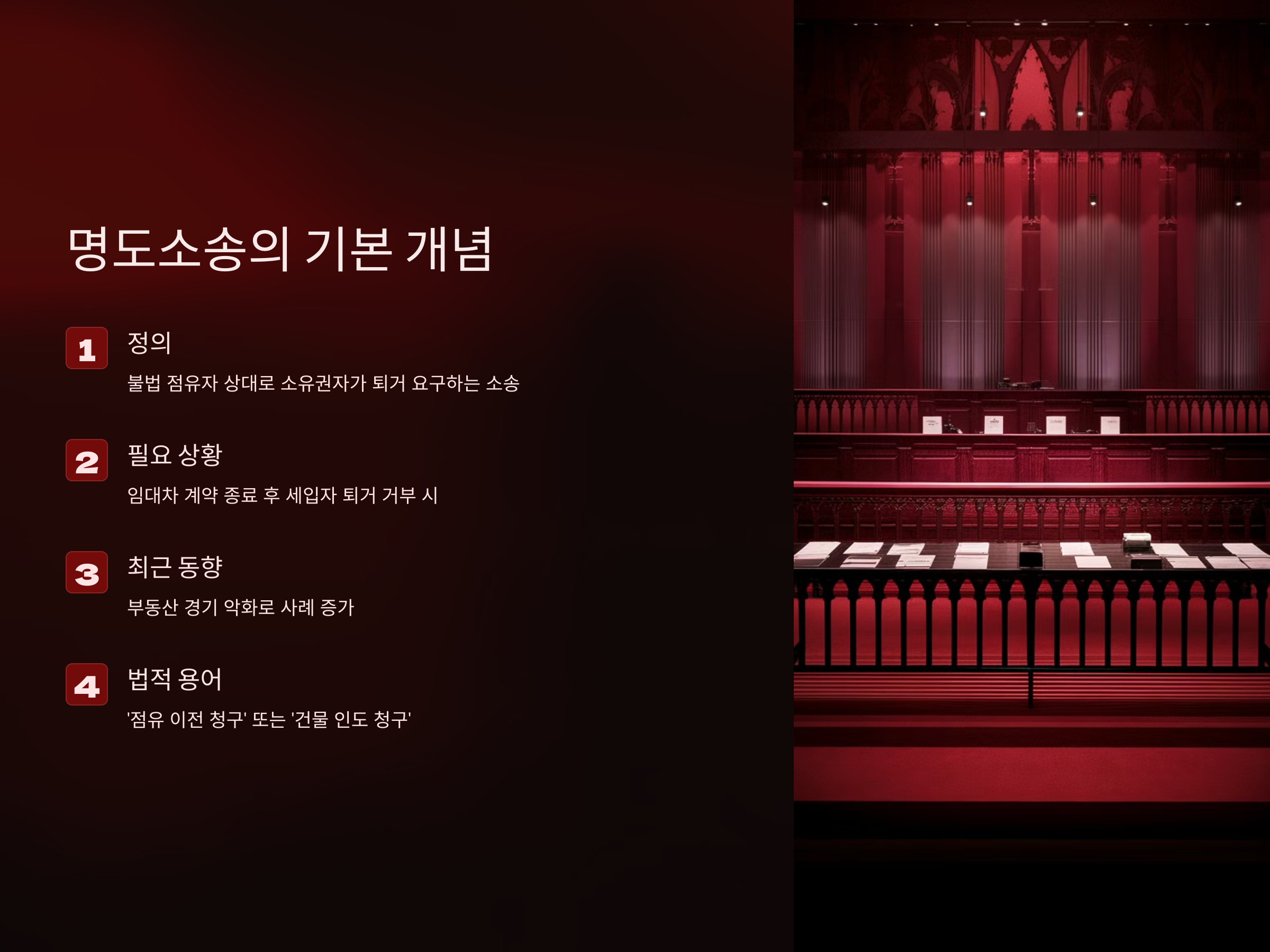 명도소송은 부동산의 불법 점유자를 상대로 소유권자 또는 임대인이 퇴거를 요구하기 위해 제기하는 소송입니다. 일반적으로 임대차 계약이 종료되었음에도 세입자가 퇴거하지 않거나, 무단으로 점유하는 경우에 진행하게 됩니다. 최근 부동산 경기가 악화되면서 명도소송 사례가 크게 늘고 있으며, 특히 상가 임대차 보호법과 주택임대차보호법 개정 이후 권리관계가 더욱 복잡해진 만큼 기본 개념을 명확히 이해하는 것이 중요합니다. 명도소송은 보통 '점유 이전 청구' 또는 '건물 인도 청구'라고도 불리며, 이에 따라 법원이 판결을 내리면 강제집행 절차로 이어집니다. 따라서 명도소송의 목적, 절차, 승소 후 강제집행까지 전체 과정을 숙지하는 것이 유리합니다.