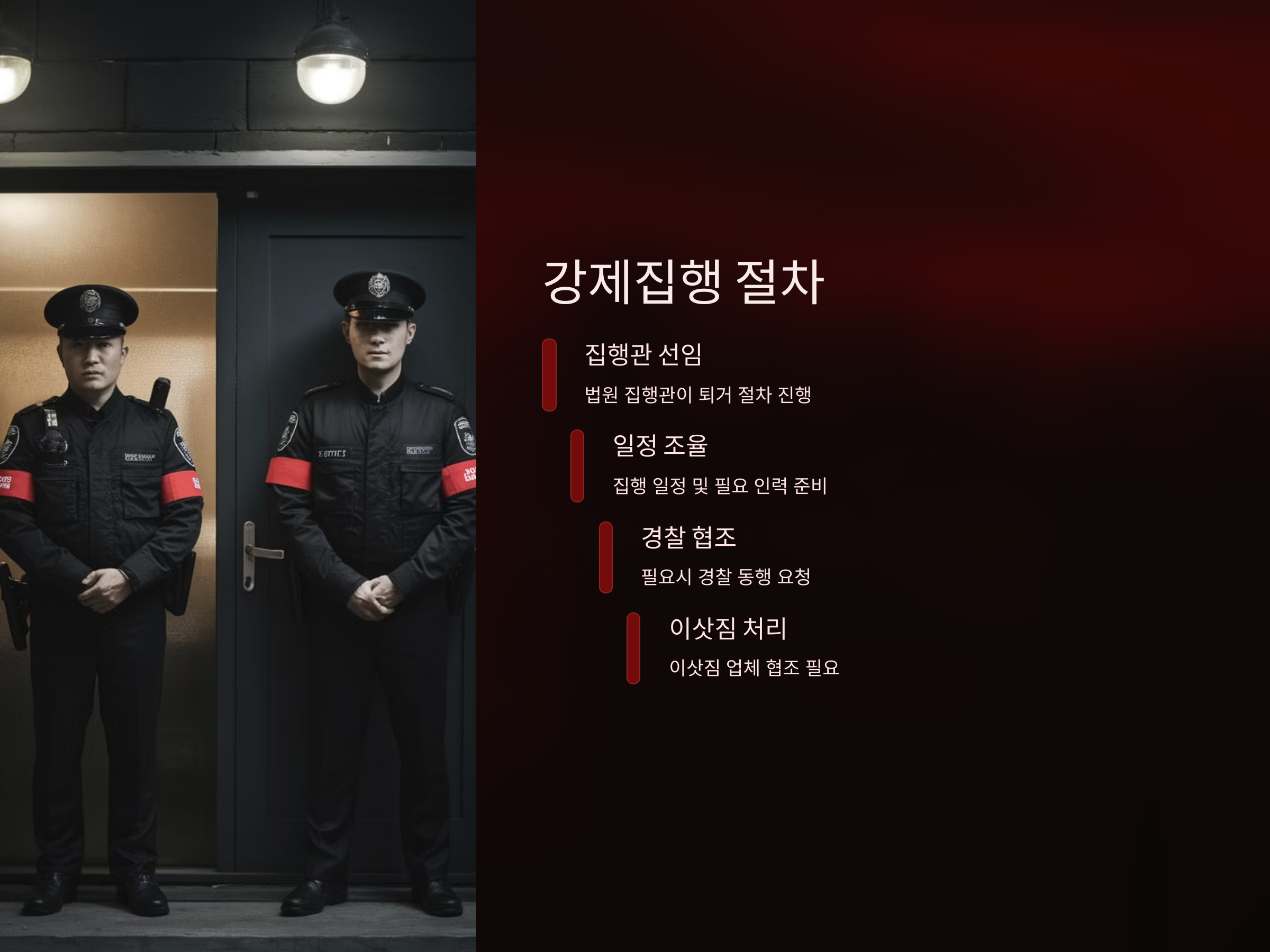 소송에서 승소하더라도, 점유자가 자진해서 퇴거하지 않는다면 강제집행을 진행해야 합니다. 강제집행은 법원의 집행관이 해당 부동산에 출입하여 점유자를 퇴거시키는 절차입니다. 이 과정에서도 비용과 시간이 소요되며, 집행 일정에 맞춰 경찰 동행이나 이삿짐 업체의 협조가 필요할 수 있습니다. 사전에 계획을 철저히 세워 진행해야 불필요한 추가 비용과 시간 낭비를 줄일 수 있습니다.