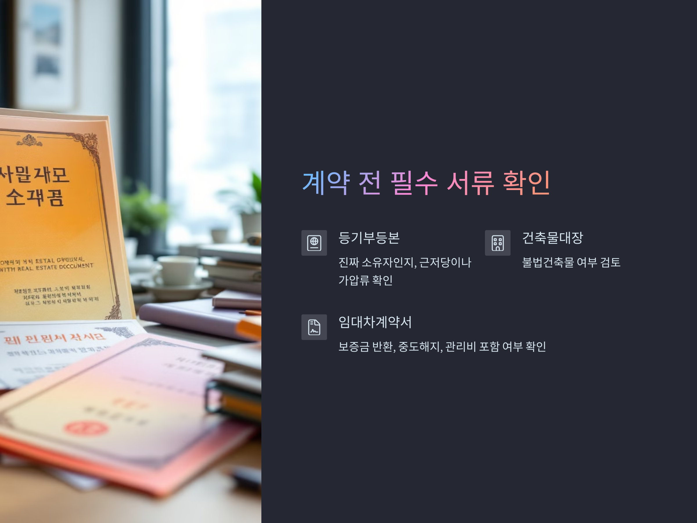 계약 전 반드시 확인해야 할 서류는 임차인의 권리를 보호하고 향후 분쟁 시 불이익을 줄이기 위해 꼭 필요합니다. 가장 먼저 확인해야 할 서류는 등기부등본입니다. 등기부등본을 통해 임대인이 진짜 소유자인지 확인할 수 있으며, 해당 부동산에 근저당이나 가압류가 설정되어 있는지도 확인할 수 있습니다. 만약 채무가 많거나 압류가 걸려 있다면 계약을 다시 고려해보는 것이 좋습니다. 두 번째로는 건축물대장과 토지대장을 확인해 불법건축물 여부를 검토해야 합니다. 불법건축물은 추후 행정처분이나 철거 조치가 내려질 수 있어 입주자에게 큰 불이익이 될 수 있습니다. 마지막으로 임대차계약서 초안을 미리 받아 내용을 충분히 검토하고, 중요한 조항(보증금 반환, 중도해지, 관리비 포함 여부 등)에 대한 명확한 기록이 필요합니다.