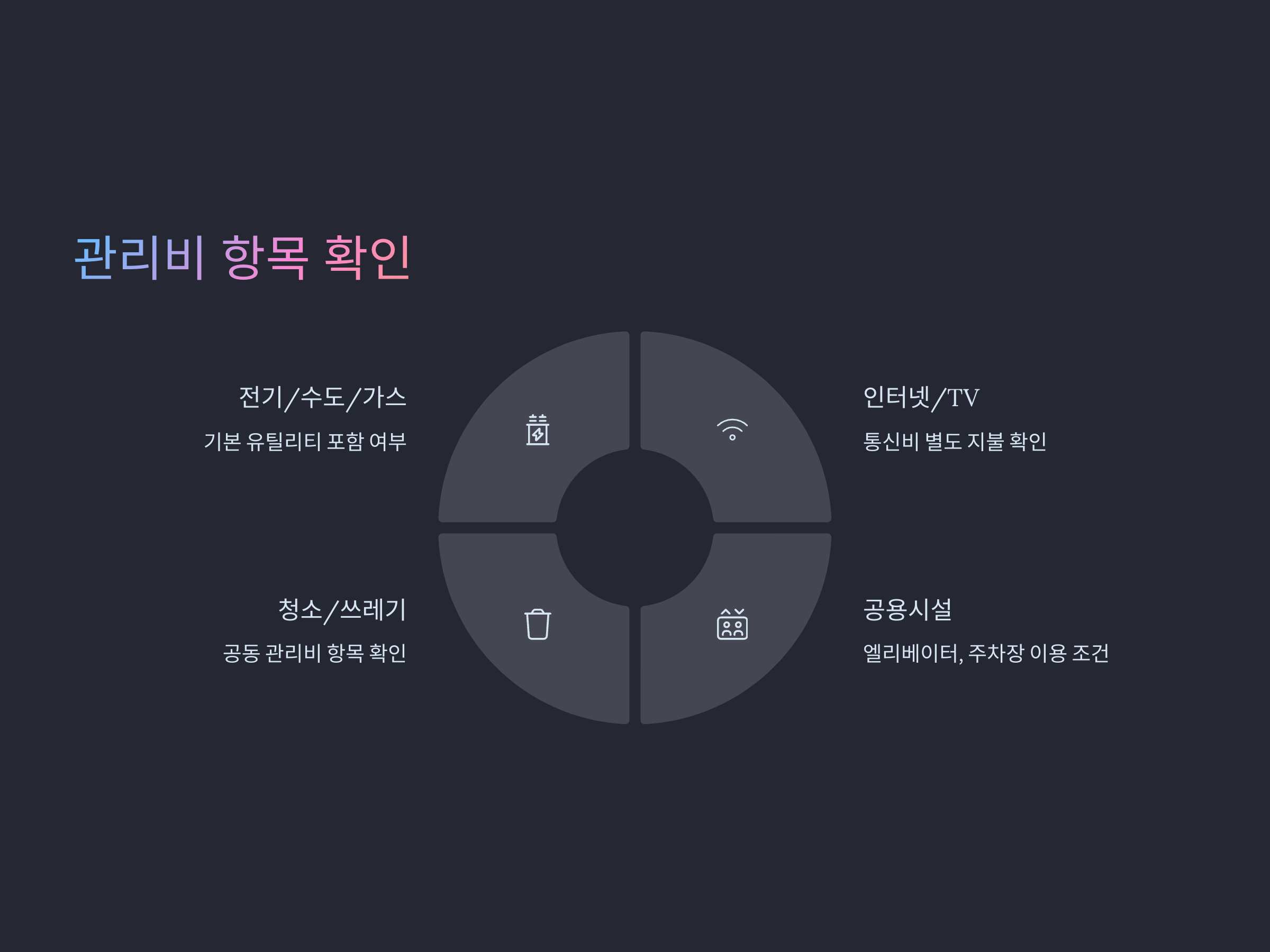 계약서상 월세 금액에 관리비가 포함되어 있는지, 어떤 항목이 별도인지 명확히 구분하는 것이 중요합니다. 일부 임대인은 전기세, 수도세, 인터넷 요금까지 포함이라고 말하지만 실제로는 일부만 포함된 경우도 많습니다. 관리비 고지서를 직접 확인하거나, 이전 세입자에게 평균 금액을 문의하는 것도 좋은 방법입니다. 공용시설(엘리베이터, 주차장, 공용전기 등)의 유지관리비, 주차 여부 및 비용, 공동현관 비밀번호 등도 사전에 확인하고, 이용 시 제한사항이 있는지도 파악해야 합니다. 특히 오피스텔이나 빌라의 경우 관리주체가 없거나 관리비 사용처가 불투명한 경우도 있어 꼼꼼한 확인이 필수입니다.