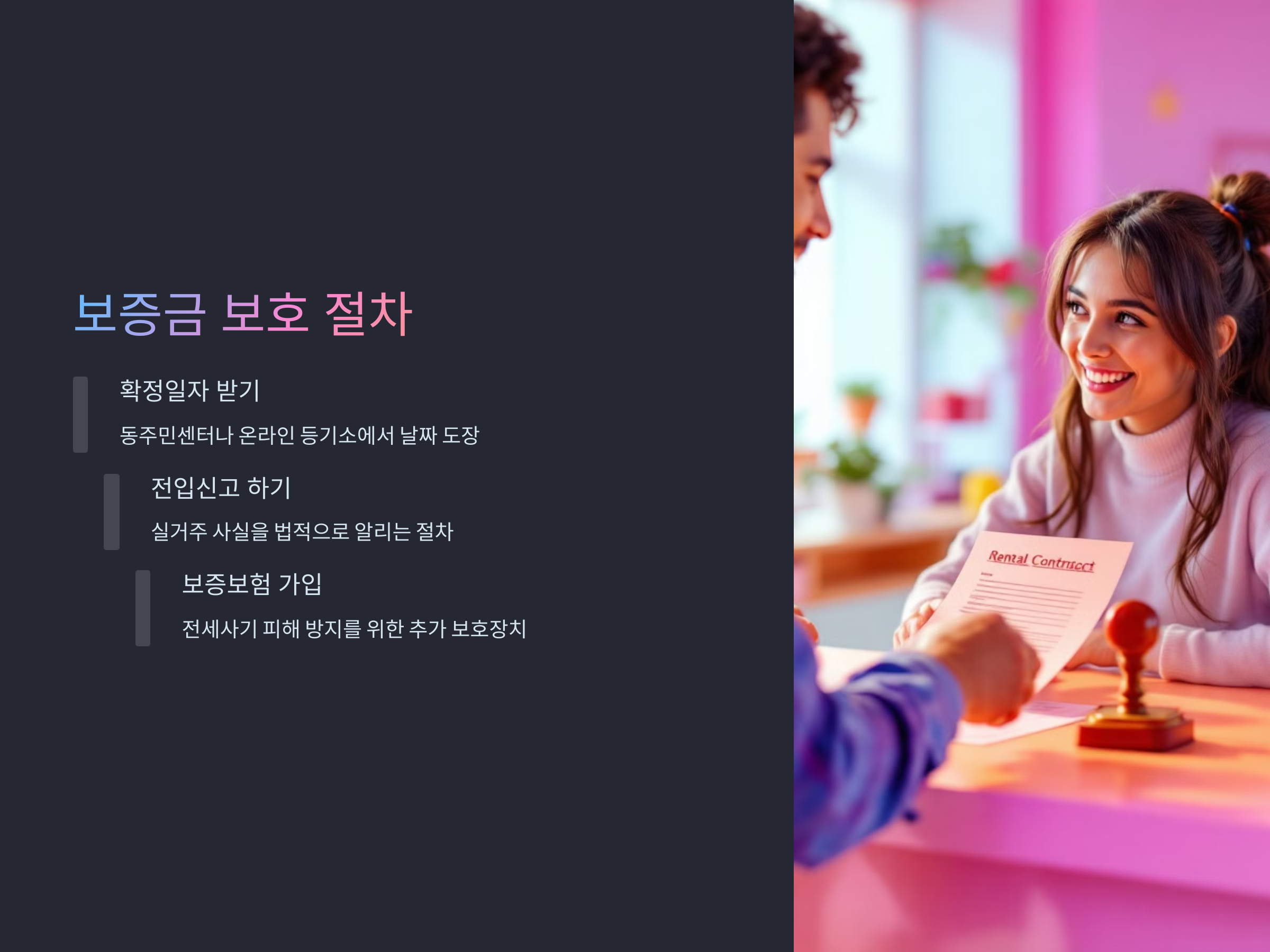 월세 계약 시 보증금은 세입자의 중요한 자산이므로 이를 보호하기 위한 법적 절차를 반드시 따라야 합니다. 대표적인 것이 ‘확정일자’와 ‘전입신고’입니다. 확정일자는 동주민센터나 온라인 등기소에서 계약서에 날짜 도장을 받는 절차로, 이를 통해 보증금을 우선변제 받을 수 있는 권리를 갖게 됩니다. 전입신고는 실거주 사실을 법적으로 알리는 절차로, 전입신고와 확정일자가 함께 있어야만 보증금 보호의 효력이 발생합니다. 특히 전세사기 피해가 확산되면서 보증보험 가입도 함께 고려하는 것이 안전합니다. 최근에는 온라인을 통한 확정일자 등록도 가능하여, 시간과 비용을 아낄 수 있는 방법으로 추천됩니다.