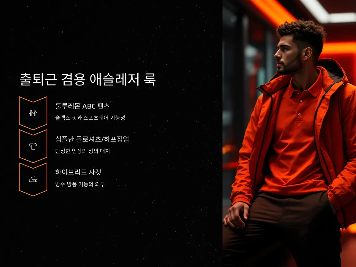 여기에 심플한 폴로셔츠나 하프집업을 매치하면 너무 격식을 차린 느낌 없이 단정한 인상을 줄 수 있습니다. 특히 자켓을 겉에 가볍게 걸쳐주면 회의나 프레젠테이션이 있는 날에도 손색이 없습니다. 출퇴근 겸용을 고려한다면 방수·방풍 기능까지 있는 하이브리드 자켓을 함께 준비해두는 것도 좋습니다.