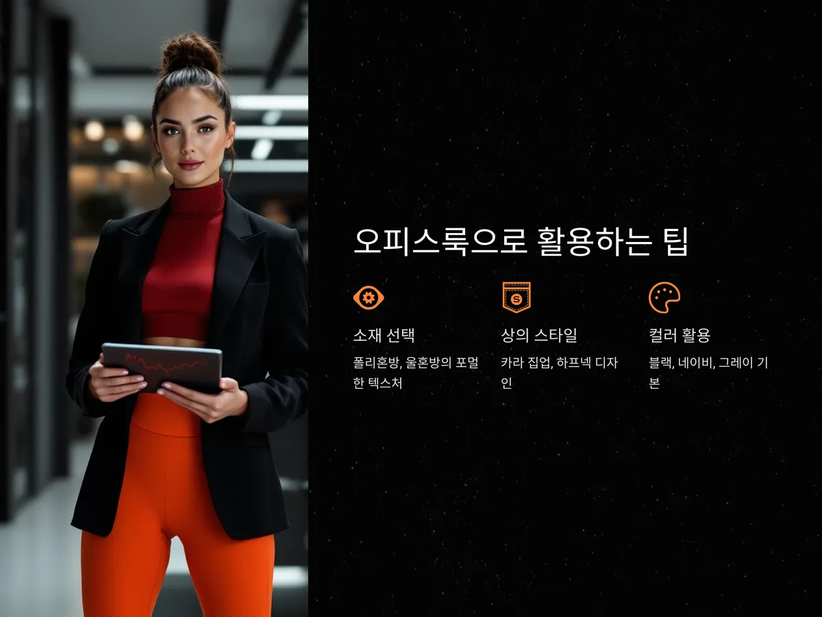 컬러는 블랙, 네이비, 그레이 등 클래식한 색상을 기본으로 하고, 액세서리나 신발에서 약간의 컬러감을 넣으면 밋밋함을 줄일 수 있습니다. 이때도 신축성과 통기성을 갖춘 기능성 소재라면 하루 종일 입고 있어도 피로감이 적습니다.