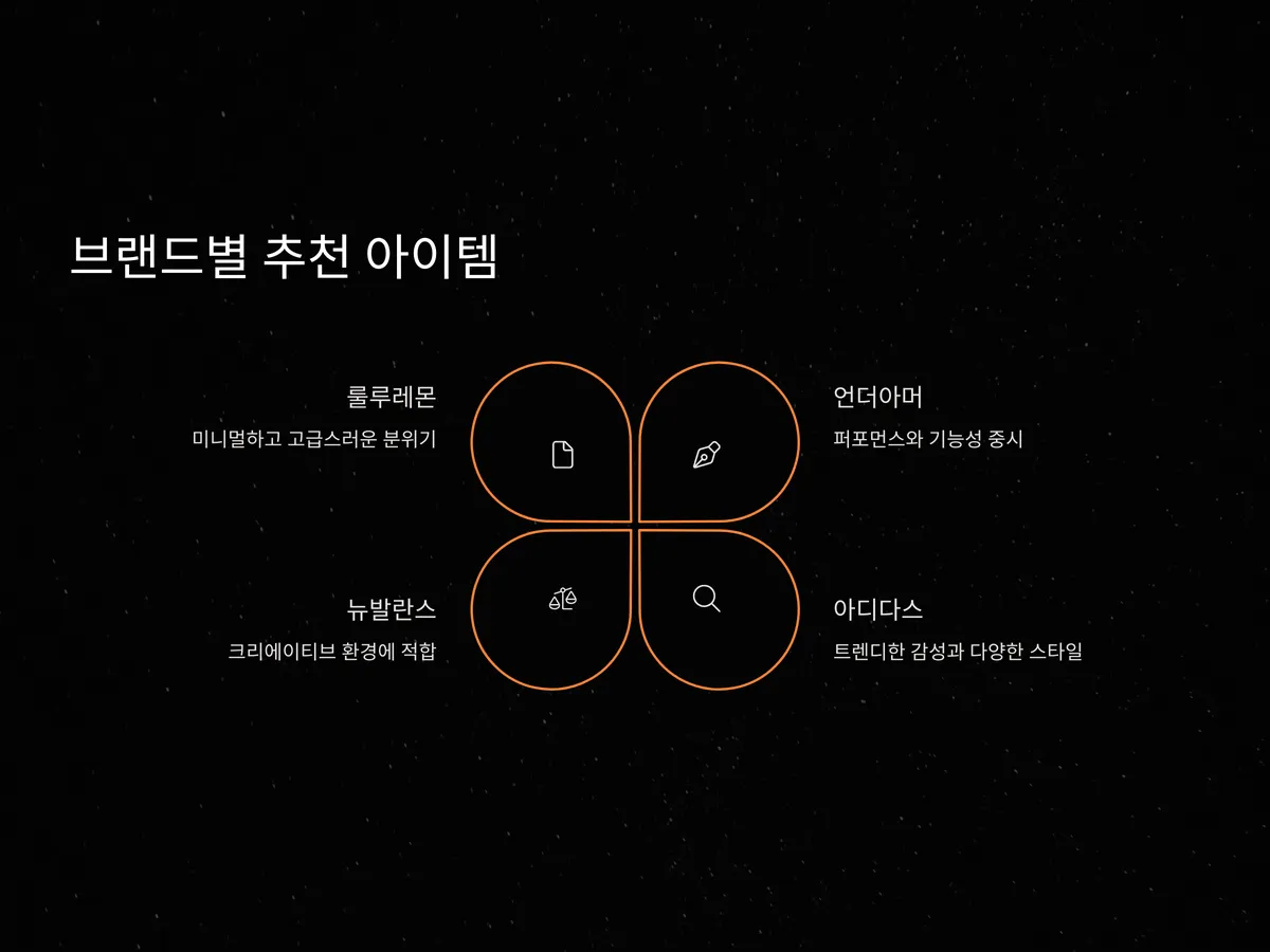 스포츠웨어 브랜드는 많지만, 각 브랜드마다 강점이 다른 만큼 이직 목적에 맞게 선택해야 합니다. 룰루레몬은 미니멀하고 고급스러운 분위기를 선호하는 분들에게, 언더아머는 퍼포먼스와 기능성을 중시하는 분들에게 적합합니다. 아디다스는 트렌디한 감성과 다양한 스타일 선택지를 제공하며, 디자이너 협업 라인도 많아 패션에 민감한 분들에게 추천됩니다.