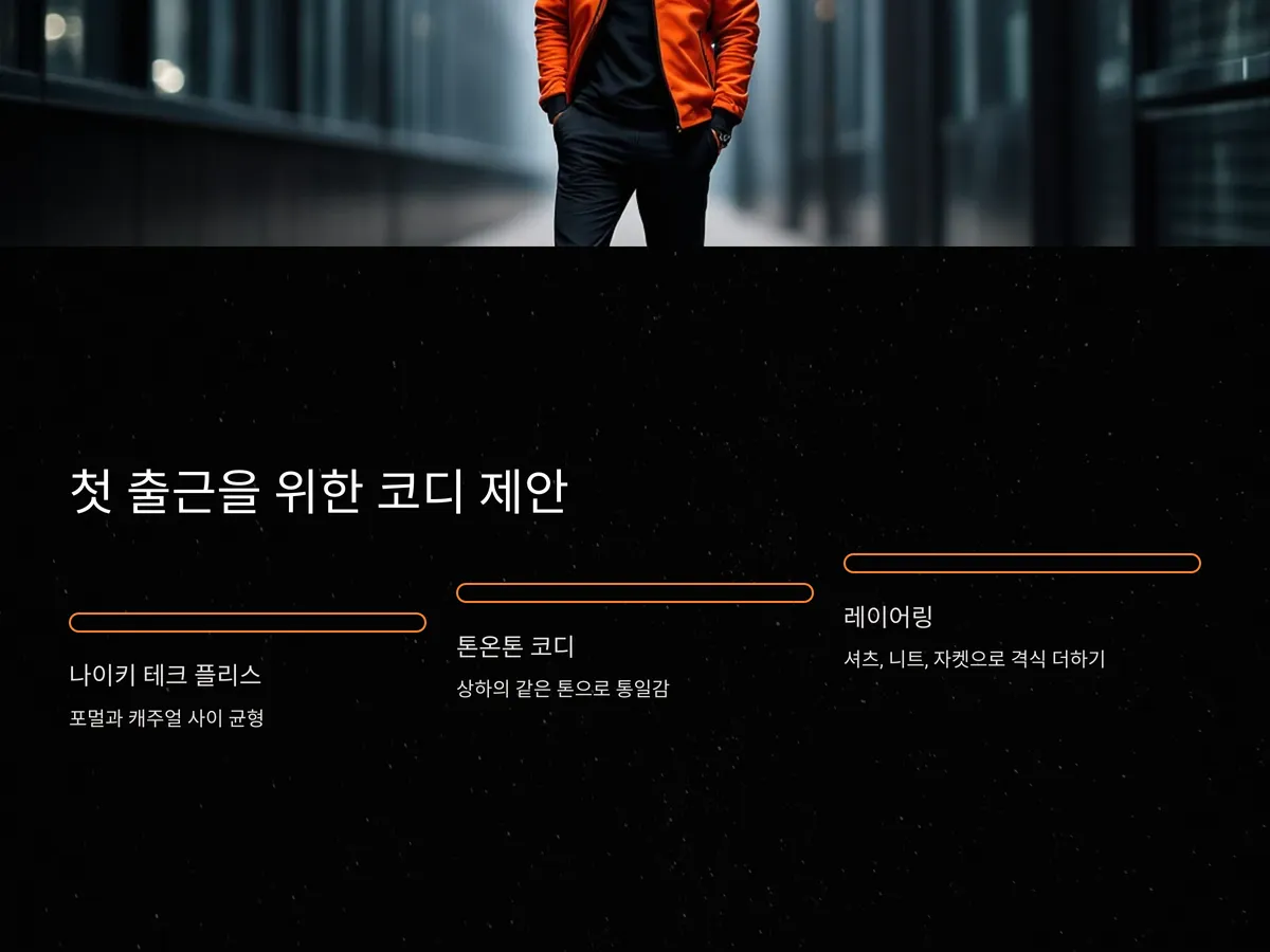 이직 후 첫 출근에서 중요한 것은 첫인상입니다. 깔끔하면서도 개성 있는 스포츠웨어는 신뢰감과 자신감을 함께 줄 수 있습니다. 나이키의 테크 플리스 시리즈는 포멀과 캐주얼 사이를 넘나들 수 있는 핏과 디자인으로, 업무 환경이 유연한 기업 문화에서 특히 잘 어울립니다.