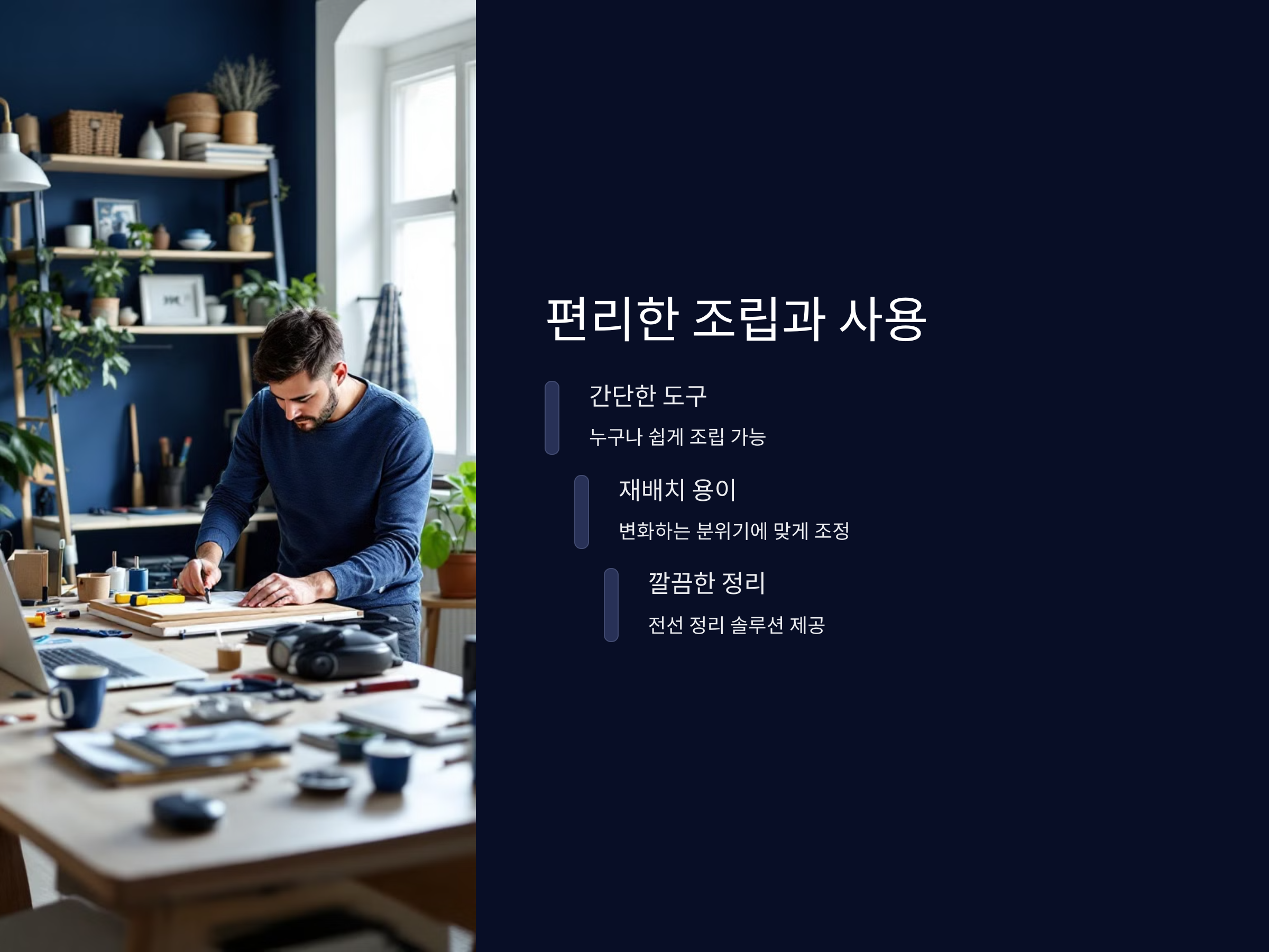 이케아의 신제품은 사용자의 편의성을 고려해 쉽게 조립할 수 있을 뿐만 아니라, 사용이 간편한 가구들이 많습니다. 예를 들어, 전자기기나 선반을 배치할 때도 선이 보이지 않도록 깔끔하게 정리할 수 있는 솔루션을 제공합니다. 이렇게 간편하게 구성할 수 있는 가구는 시간과 노력을 절약할 수 있게 해 줍니다.