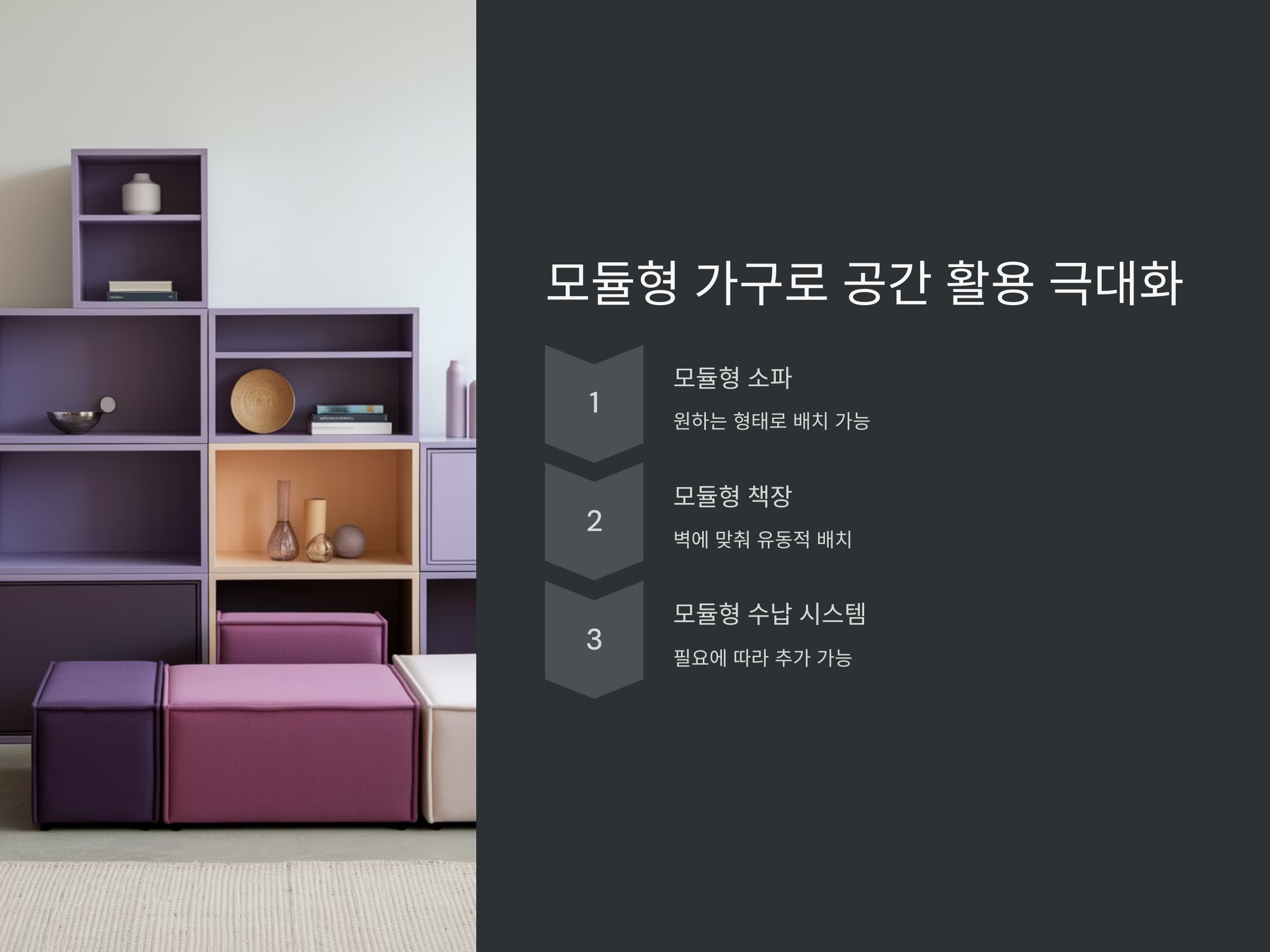모듈형 가구는 공간을 매우 유연하게 활용할 수 있게 해줍니다. 작은 공간에서는 매우 유용하며, 공간에 따라 변형할 수 있어 더욱 효율적입니다.