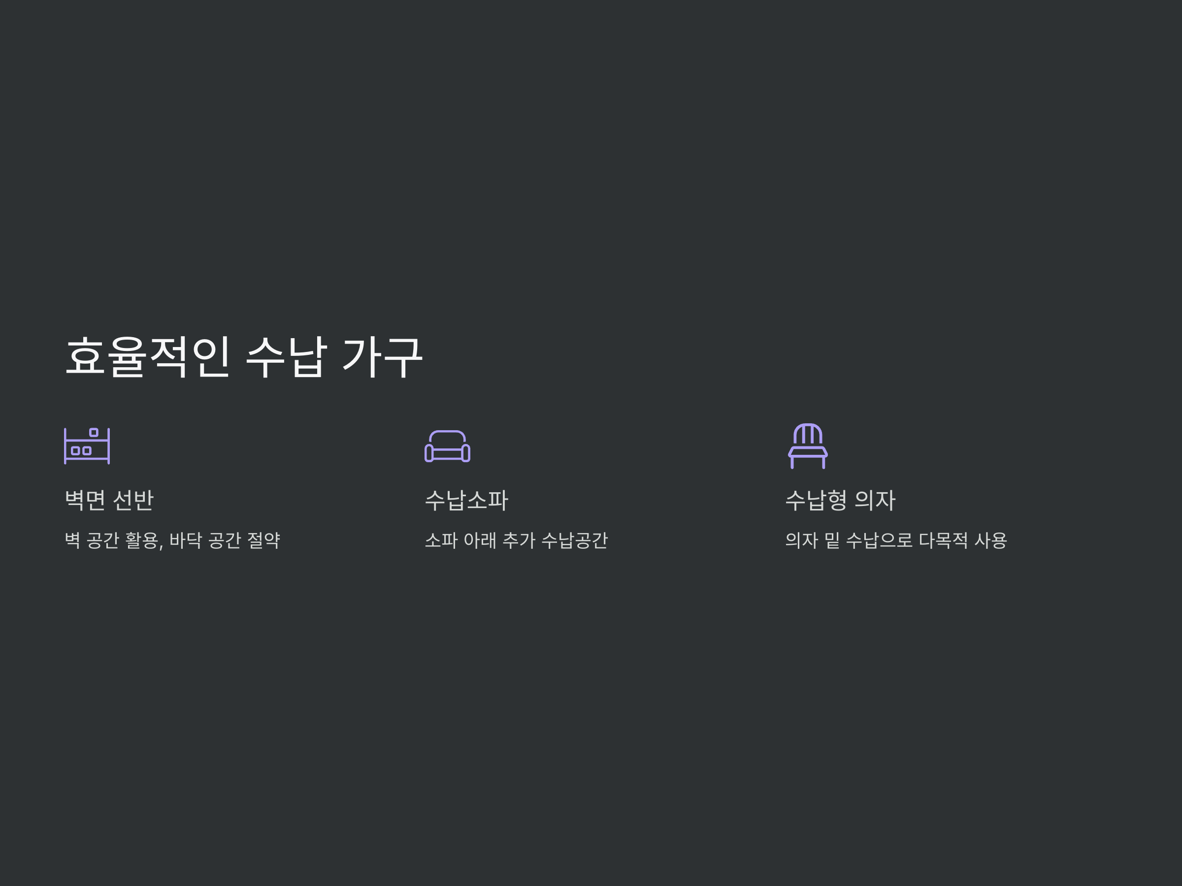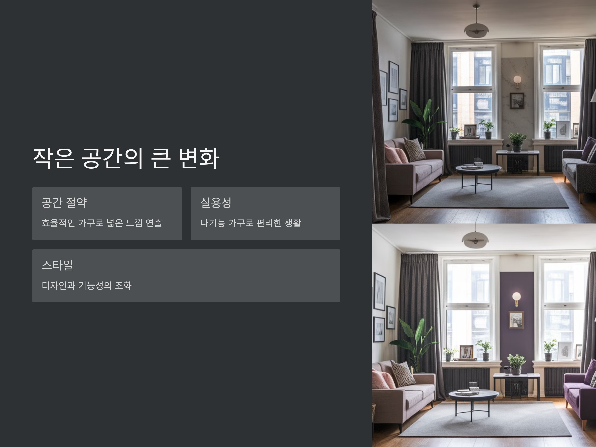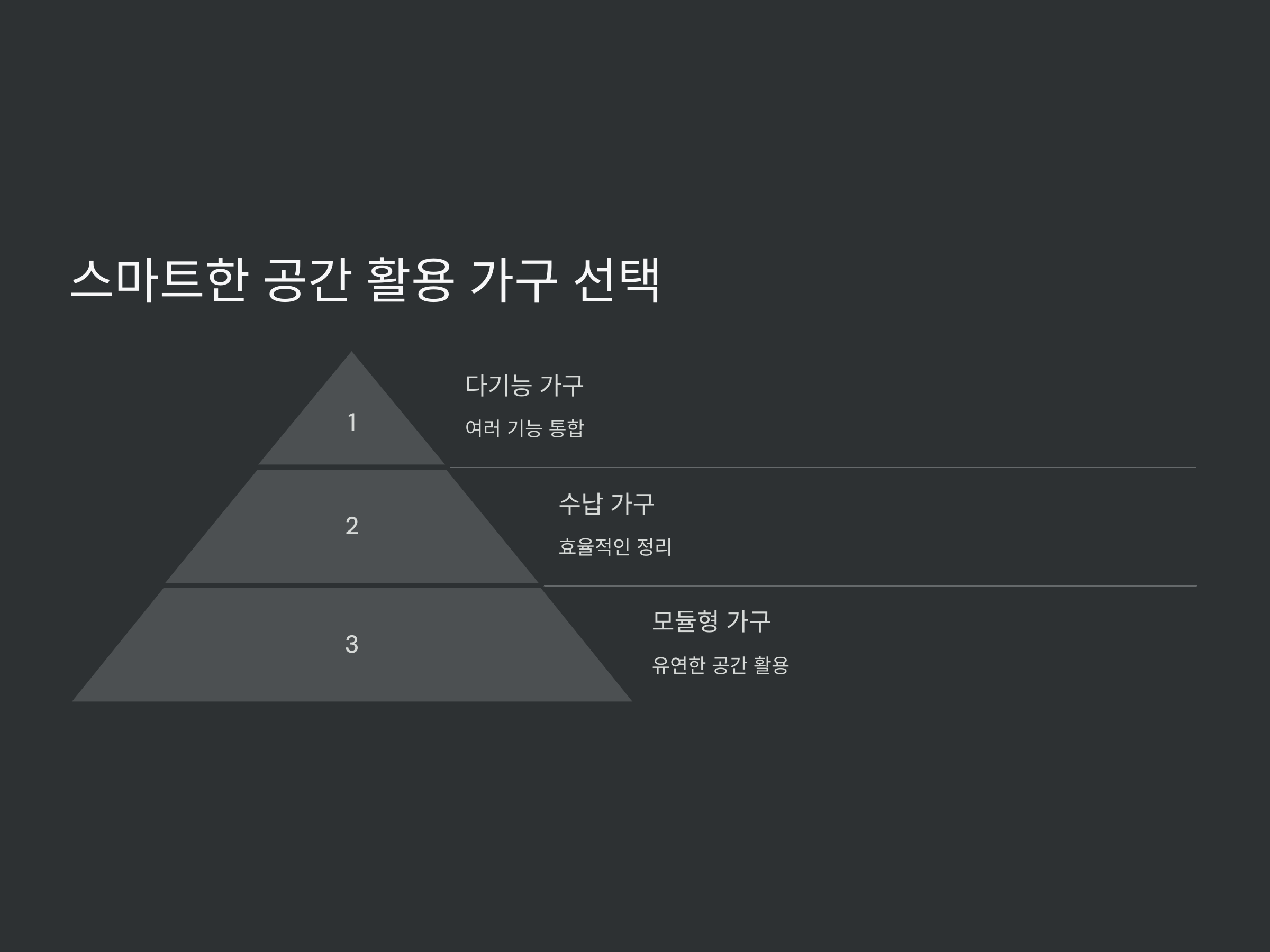 좁은 공간에서도 효율적으로 활용할 수 있는 다양한 가구들이 있습니다. 다기능 가구, 수납 가구, 모듈형 가구 등은 모두 공간을 최대한 활용하면서도 실용적이고 스타일리시한 인테리어를 만들어줍니다. 자신의 공간에 맞는 가구를 선택하여, 공간을 절약하고, 동시에 편리하게 사용할 수 있도록 구성하는 것이 중요합니다.