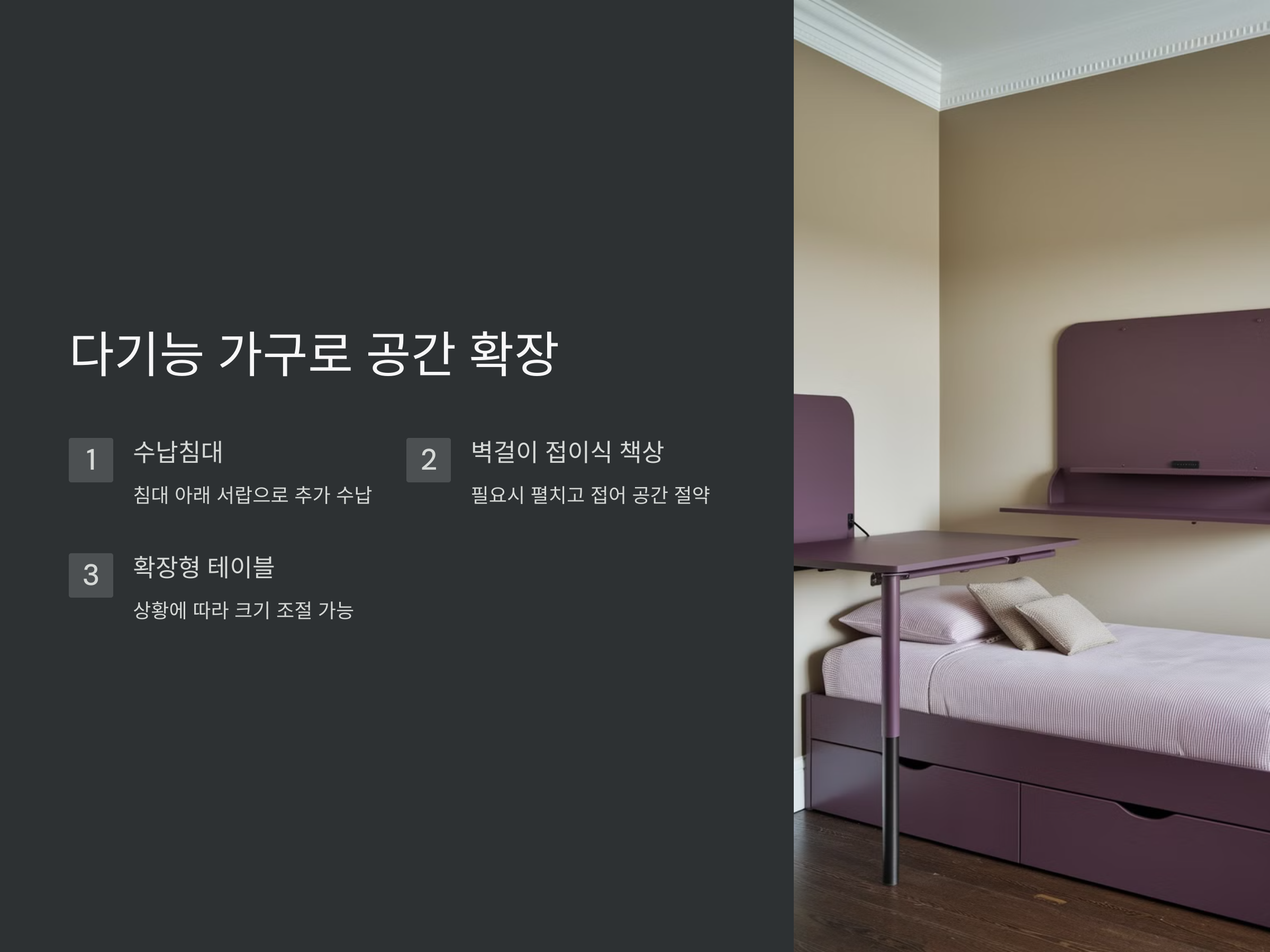 이처럼 다기능 가구는 좁은 공간에서도 실용적이면서도 스타일리시한 인테리어를 완성해줄 수 있습니다. 필요할 때만 펼쳐서 사용하고, 나머지 시간에는 공간을 절약하는 방식으로 활용할 수 있기 때문에, 작은 공간을 가진 사람들에게는 매우 유용합니다.