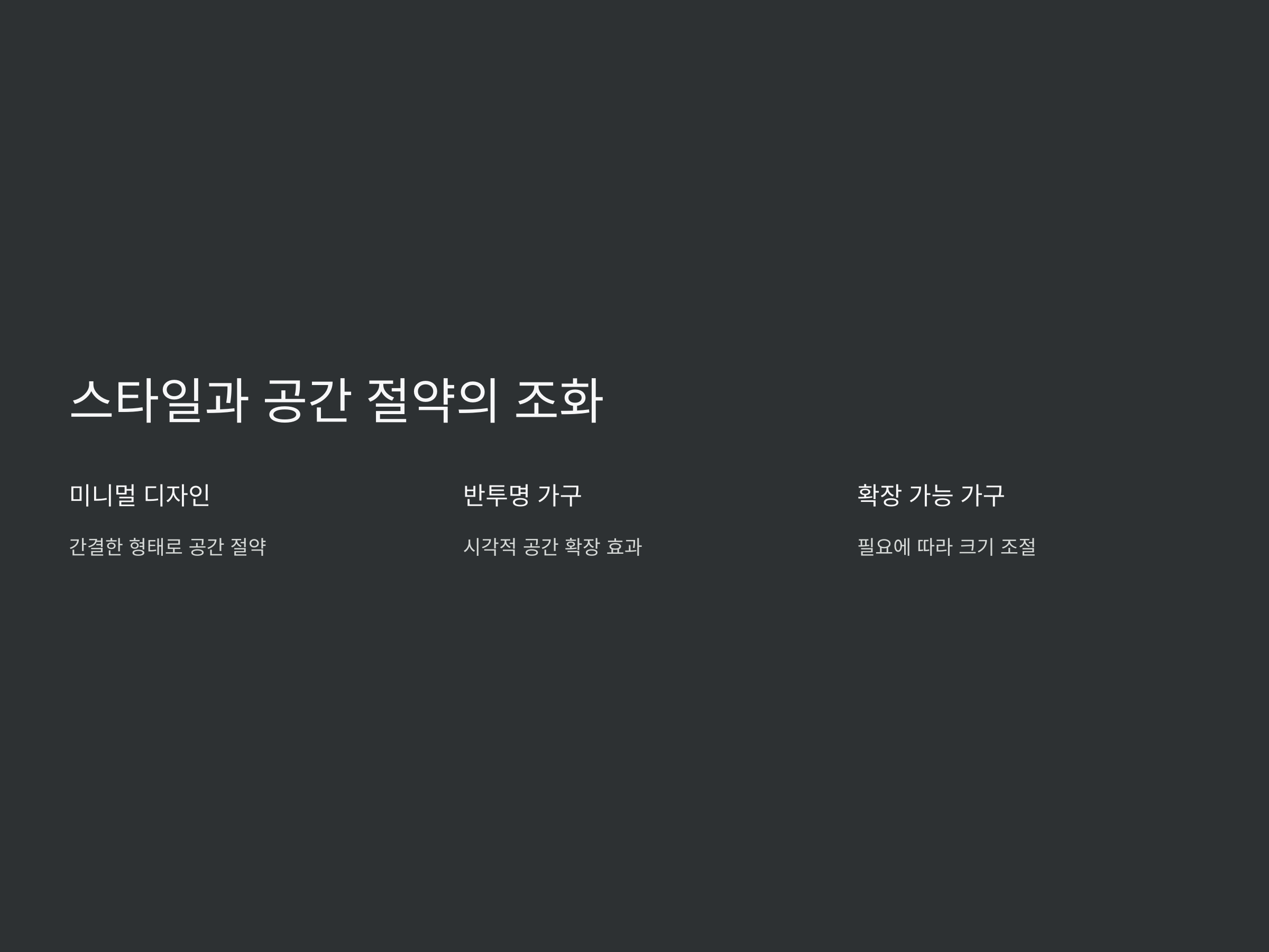 - 미니멀한 디자인의 가구: 간결하고 깔끔한 디자인의 가구는 공간을 덜 차지하면서도 세련된 느낌을 줍니다. 예를 들어, 얇은 다리와 간결한 형태를 가진 테이블이나 의자는 공간을 절약하면서도 시각적으로 편안한 느낌을 줍니다.
