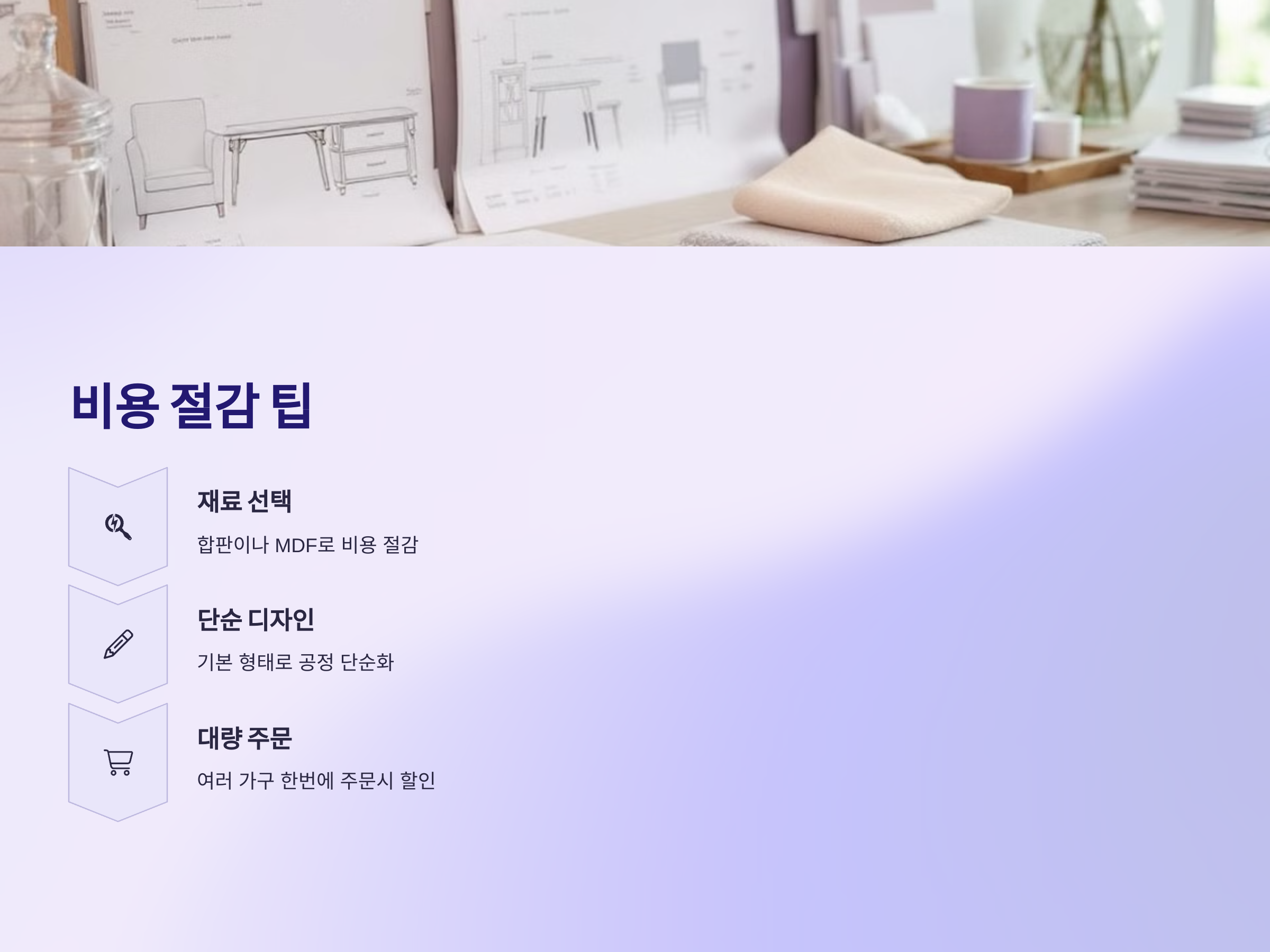 고급 재료는 비용을 상승시키기 때문에, 예산에 맞는 적절한 재료를 선택하는 것이 중요합니다. 예를 들어, 고급 목재 대신 합판이나 MDF를 사용하면 비용을 절감할 수 있습니다. 또한, 표면 마감 처리를 단순하게 하여 비용을 줄이는 것도 좋은 방법입니다.