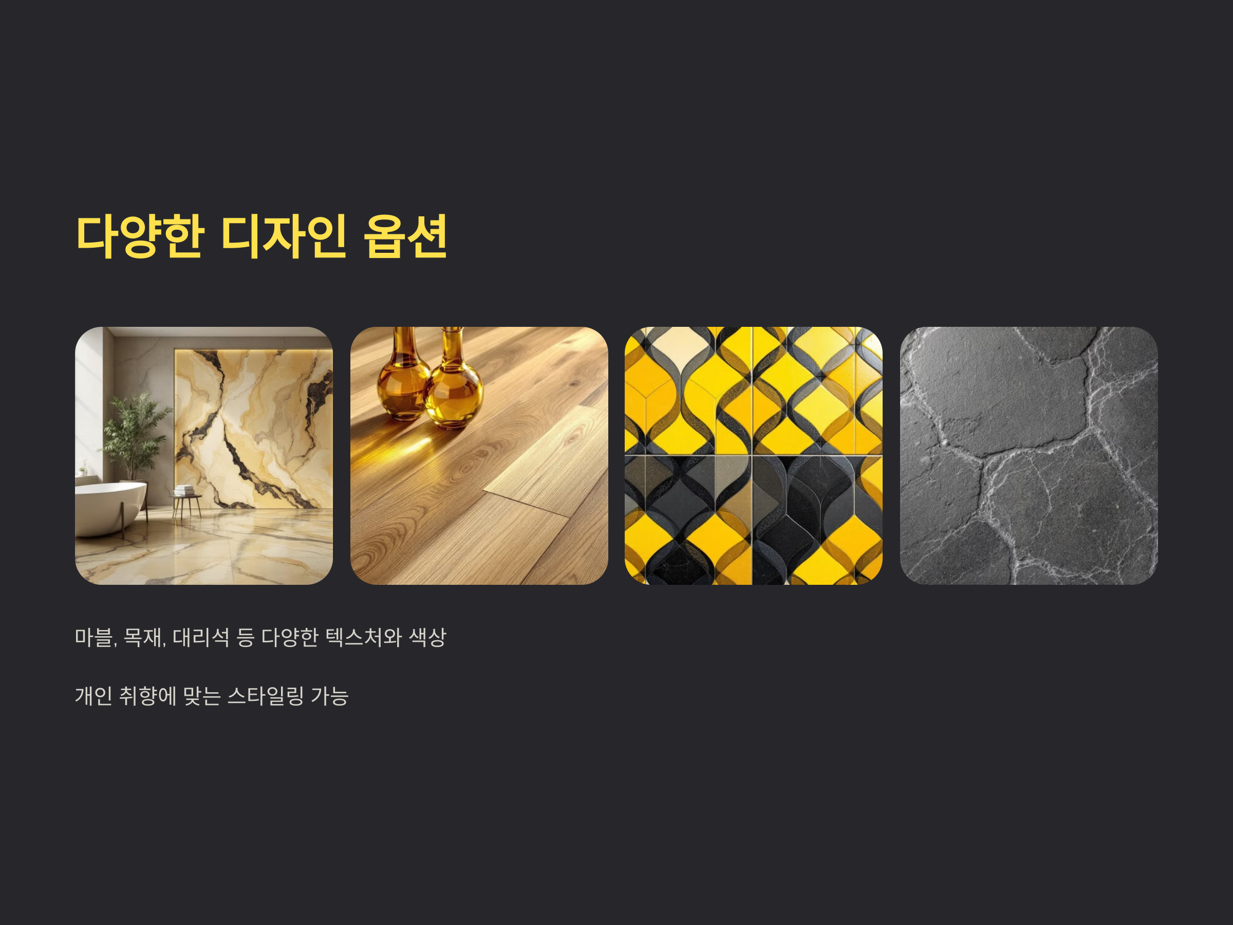 - 모던한 디자인: 간결하고 깔끔한 디자인을 원한다면, 흰색, 회색, 또는 블랙 컬러의 단색 타일을 사용하는 것이 좋습니다. 이는 심플하면서도 세련된 분위기를 연출합니다.