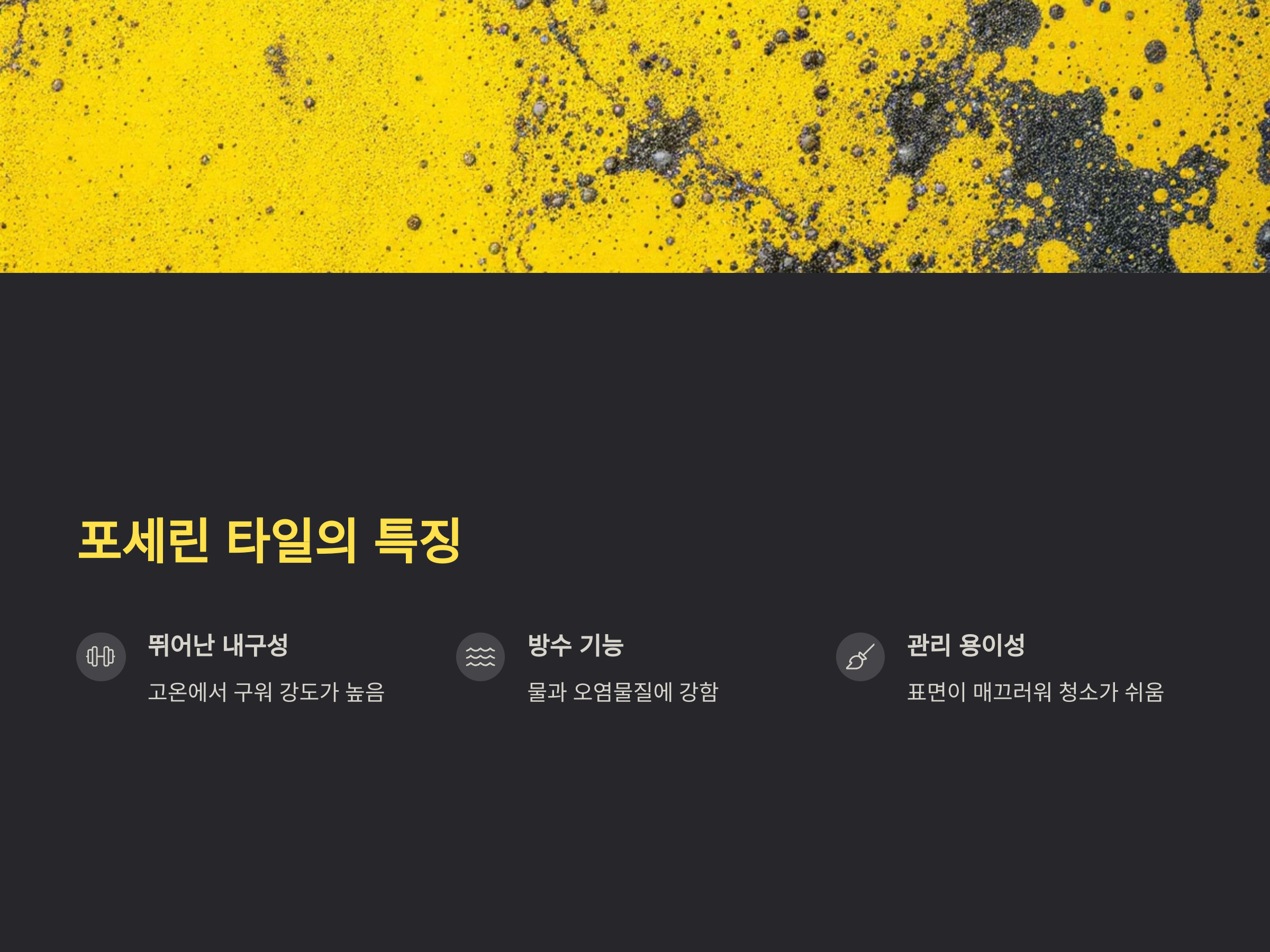 그럼에도 불구하고 타일의 마모나 오염을 방지하기 위해 주기적인 관리가 필요합니다. 타일 표면이 마모되지 않도록 강한 화학 세제를 사용하지 않는 것이 좋습니다. 표면을 손상시키지 않도록 부드러운 세제를 사용하고, 세척 후에는 마른 걸레로 닦아주는 것이 좋습니다.