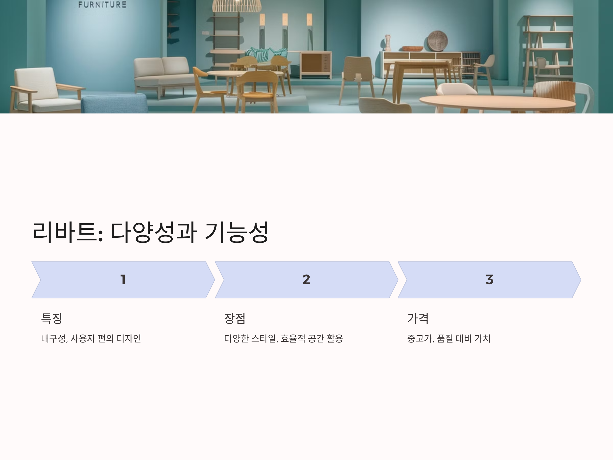 리바트의 가장 큰 장점은 다양한 가구 스타일을 제공한다는 점입니다. 다양한 색상과 디자인으로 선택의 폭이 넓고, 그 어떤 스타일에도 잘 어울립니다. 가격은 다소 높지만, 품질과 디자인 면에서 충분한 가치를 제공합니다.