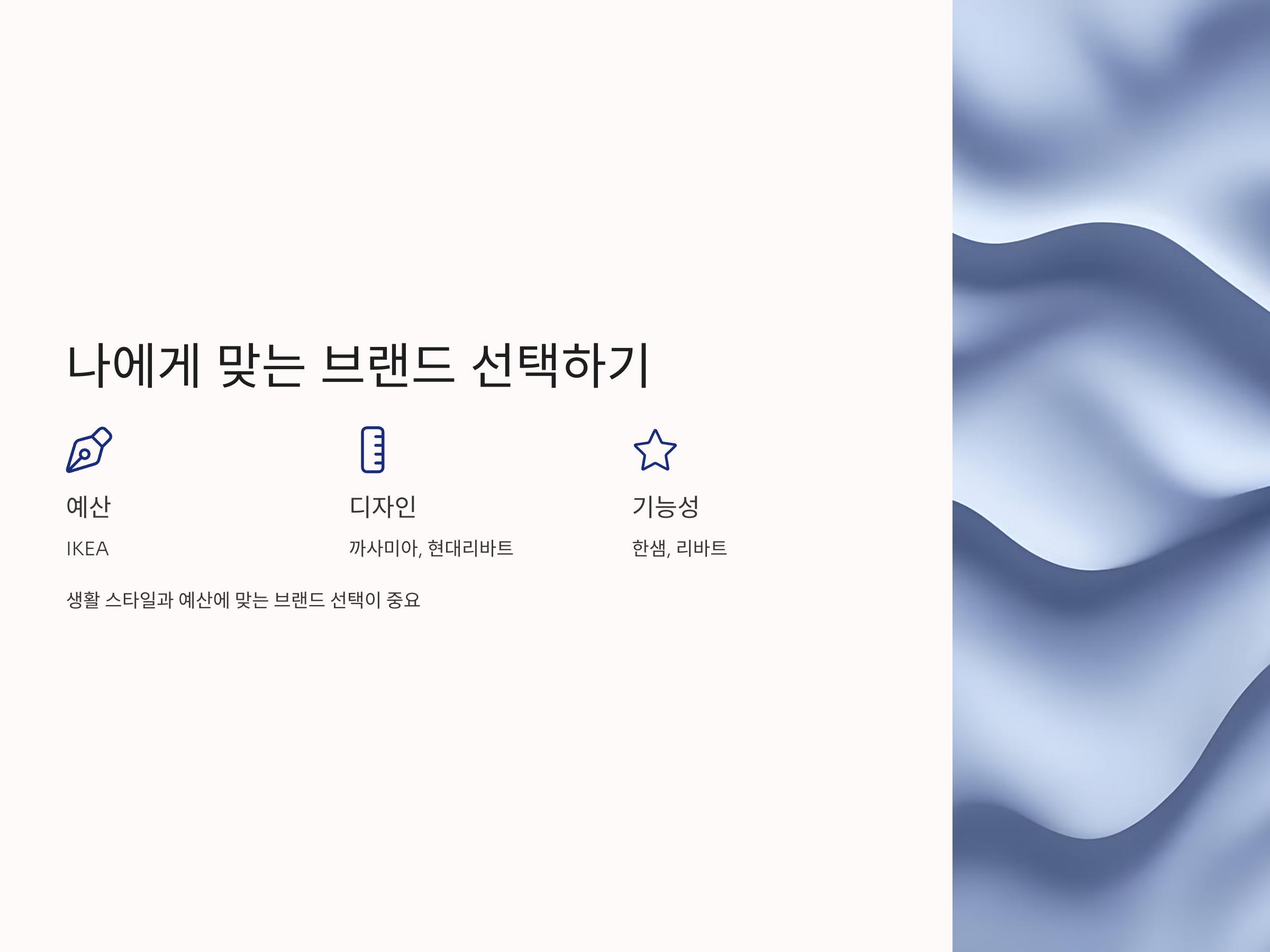 조립식 가구 브랜드를 선택할 때 가장 중요한 것은 나의 생활 스타일과 예산에 맞는 브랜드를 고르는 것입니다. 가격을 중시하는 사람이라면 IKEA가 적합할 수 있으며, 디자인과 고급스러움을 원하는 사람은 까사미아나 현대리바트를 선택하는 것이 좋습니다. 한샘과 리바트는 실용성과 기능성을 강조하는 브랜드로, 다양한 공간에서 효율적으로 사용할 수 있는 가구들이 많습니다.