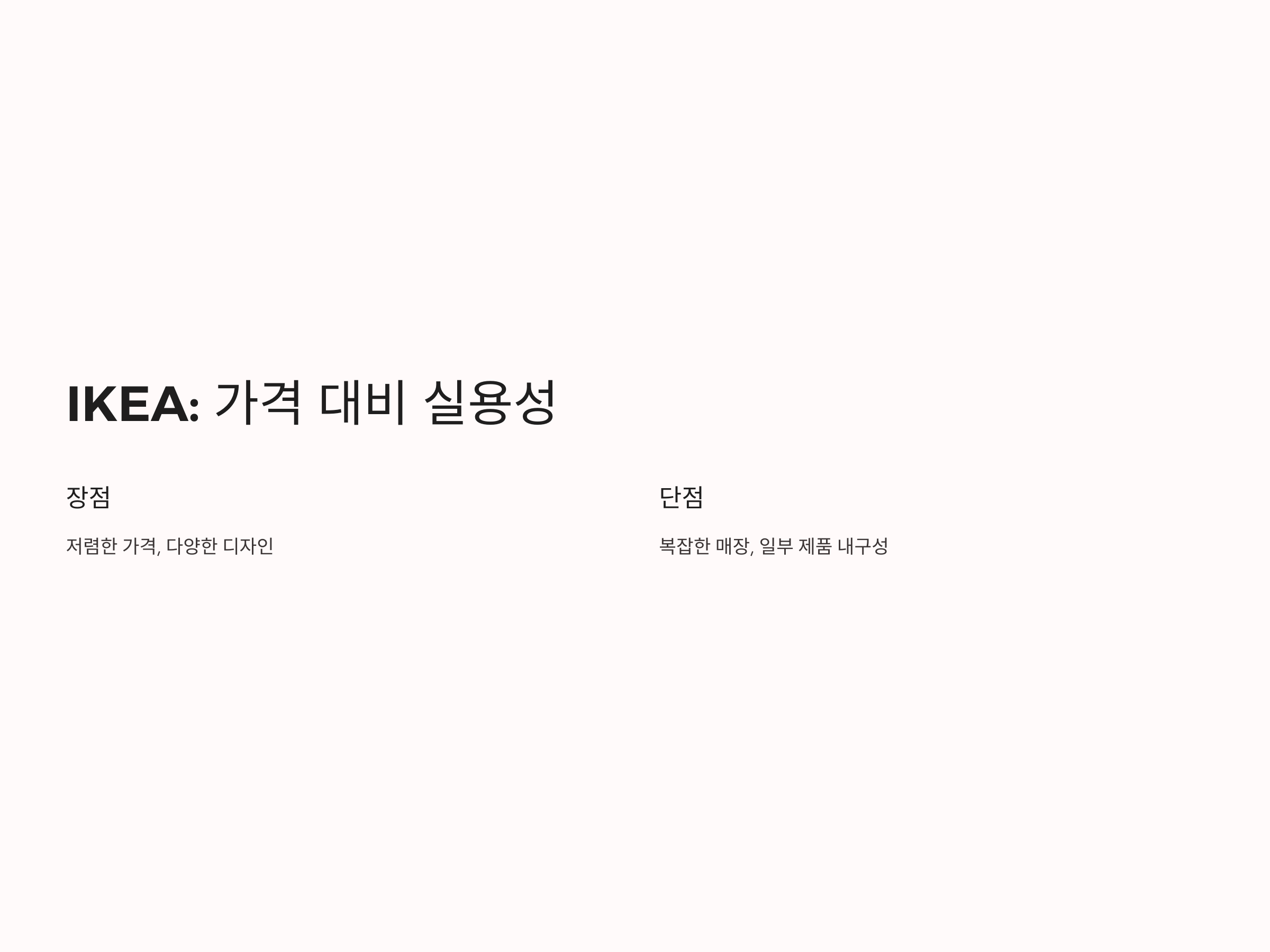 하지만 IKEA의 단점으로는 몇 가지가 있습니다. 첫째, 모든 제품이 저렴한 가격대를 유지하고 있지만, 일부 제품은 품질에 비해 너무 저렴한 가격을 책정하여 내구성에 문제가 있을 수 있습니다. 둘째, IKEA 매장이 상당히 복잡하고, 상품을 직접 찾아야 하는 불편함이 있을 수 있습니다. 하지만 이러한 점을 고려하더라도 여전히 가격과 품질의 균형을 잘 맞춘 브랜드로, 많은 사람들이 IKEA를 선택합니다.