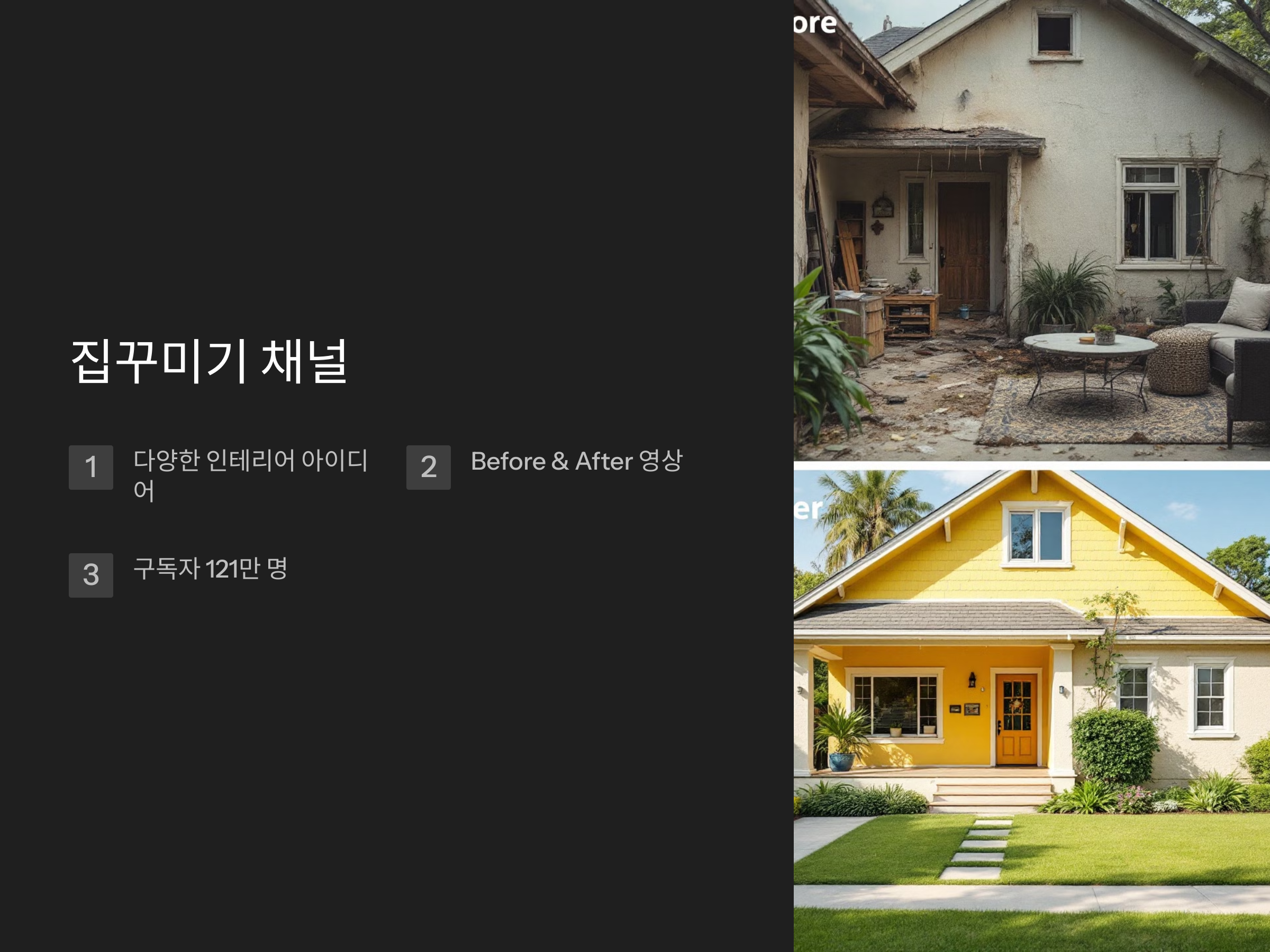 '집꾸미기' 채널은 누구나 쉽고 편하게 집을 꾸밀 수 있도록 다양한 인테리어 아이디어와 팁을 제공합니다. 주거 공간의 Before & After 영상과 실제 사례를 통해 현실감 있는 정보를 얻을 수 있습니다.