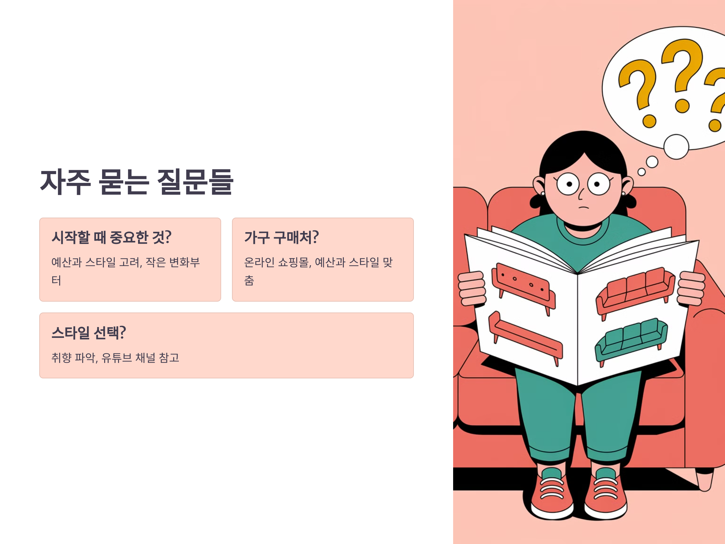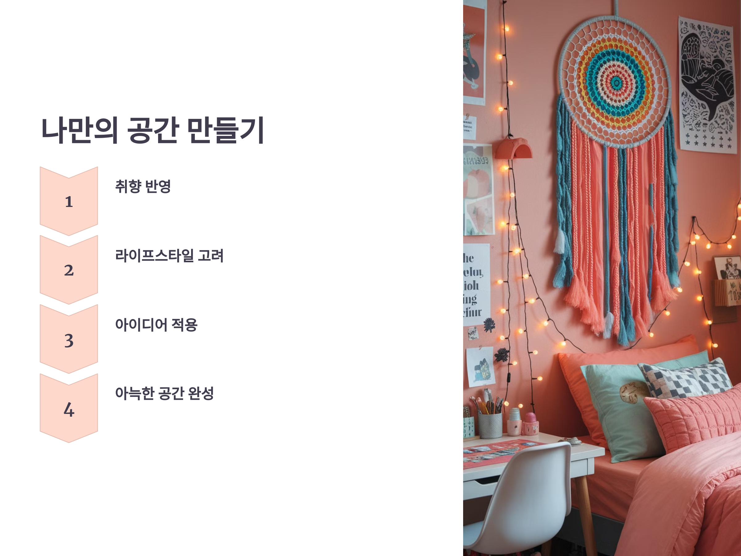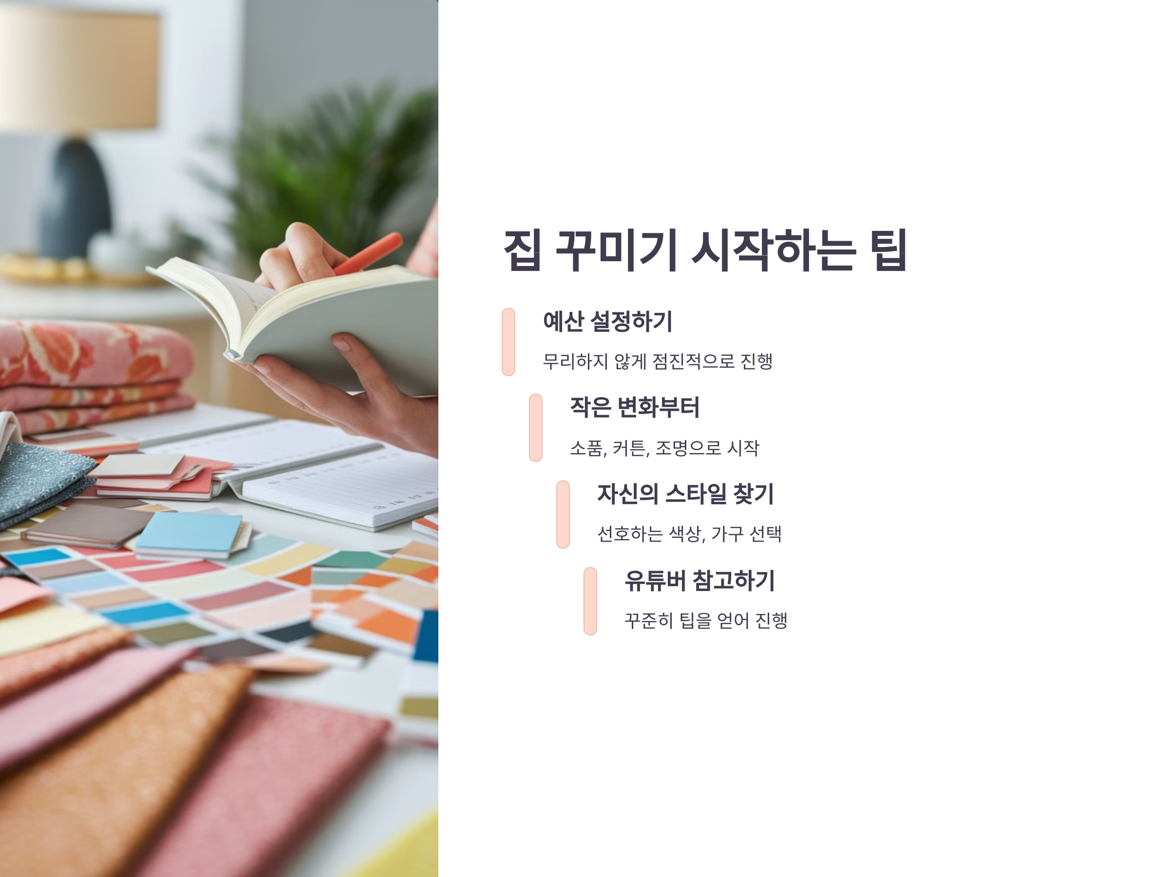 예산과 자신의 스타일을 먼저 고려하는 것이 중요합니다. 그리고 작은 변화부터 시작해 점차적으로 공간을 바꿔나가는 것이 좋습니다.