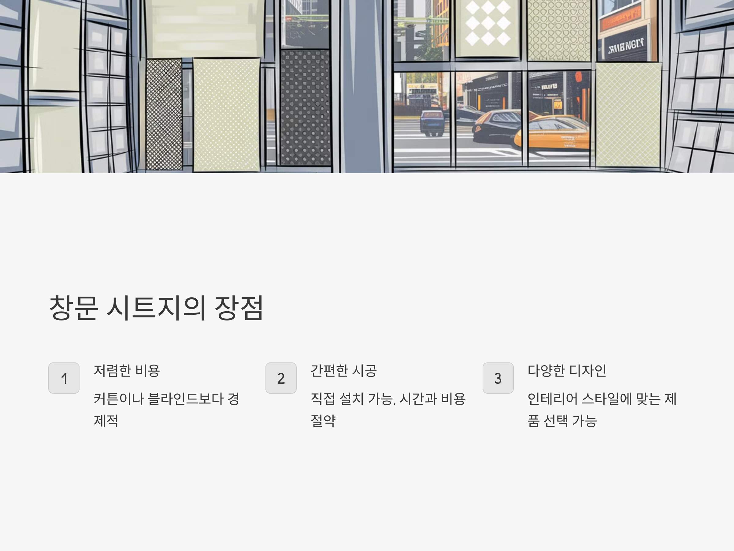 창문 시트지의 가장 큰 장점은 저렴한 비용과 간편한 시공입니다. 커튼이나 블라인드를 설치하는 것보다 훨씬 적은 비용으로 창문을 꾸밀 수 있으며, 직접 시공이 가능하여 시간과 비용을 절약할 수 있습니다. 또한, 시트지는 매우 다양한 디자인을 제공하므로 집의 인테리어 스타일에 맞는 제품을 고를 수 있습니다.