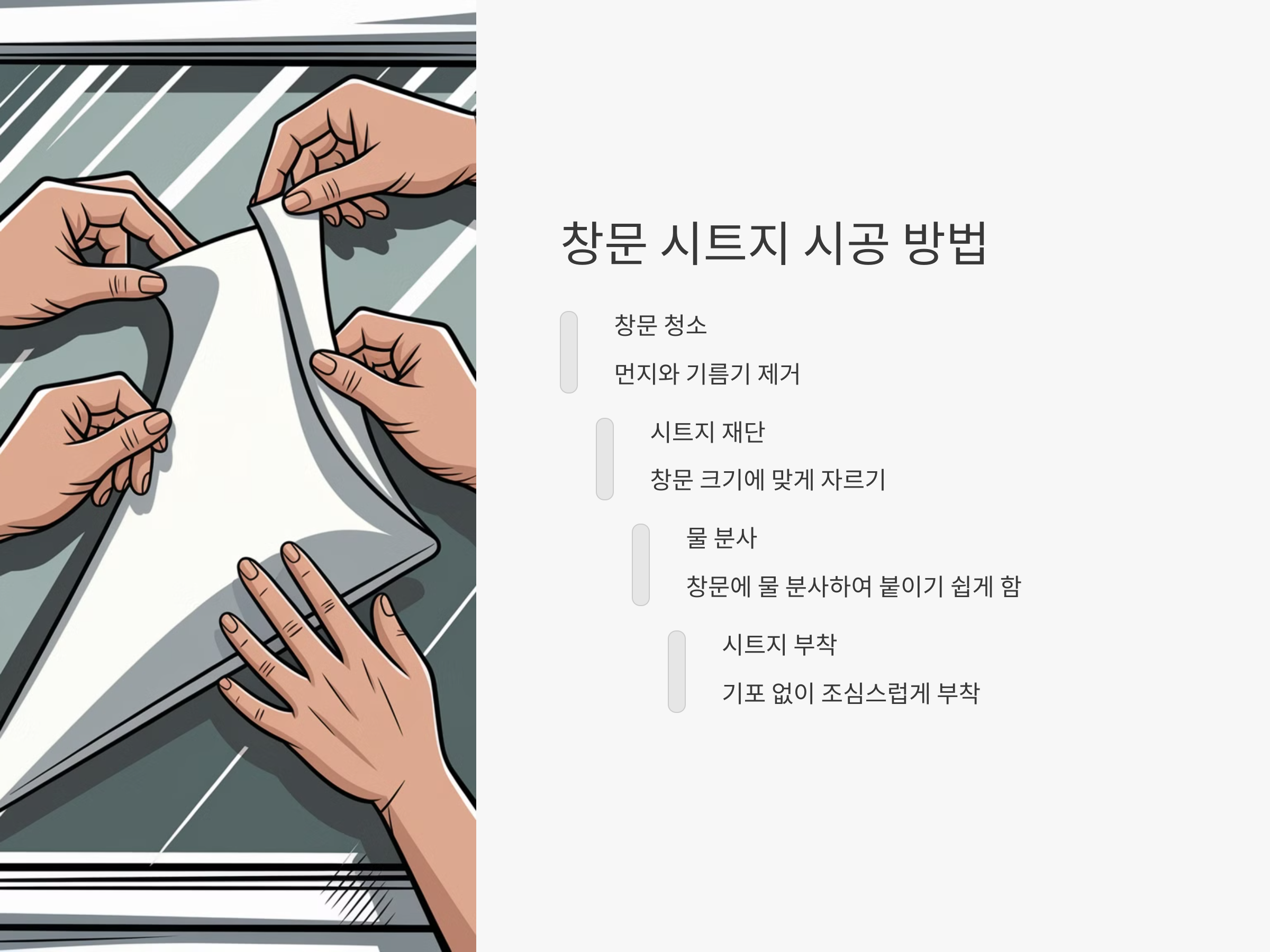 창문 시트지를 시공하는 방법은 생각보다 간단합니다. 시트지를 창문에 맞게 자르고, 물로 적셔서 붙이는 방식이 일반적입니다. 시트지를 붙이기 전에 창문을 깨끗하게 청소해주는 것이 중요합니다. 기포나 주름이 생기지 않도록 조심스럽게 시트지를 붙여주면 깔끔한 결과를 얻을 수 있습니다.