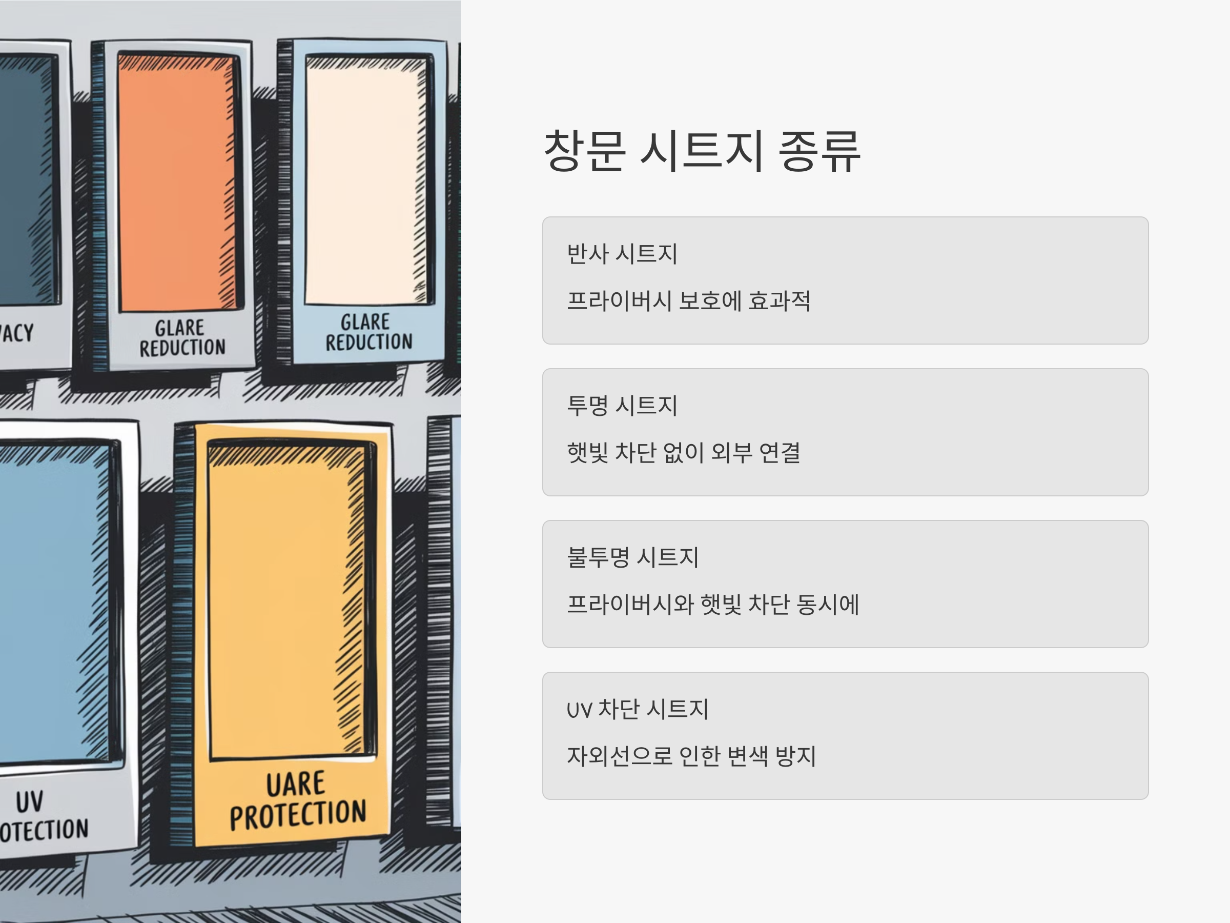 - 반사 시트지: 외부에서 내부가 보이지 않게 해주며, 프라이버시 보호에 효과적입니다.