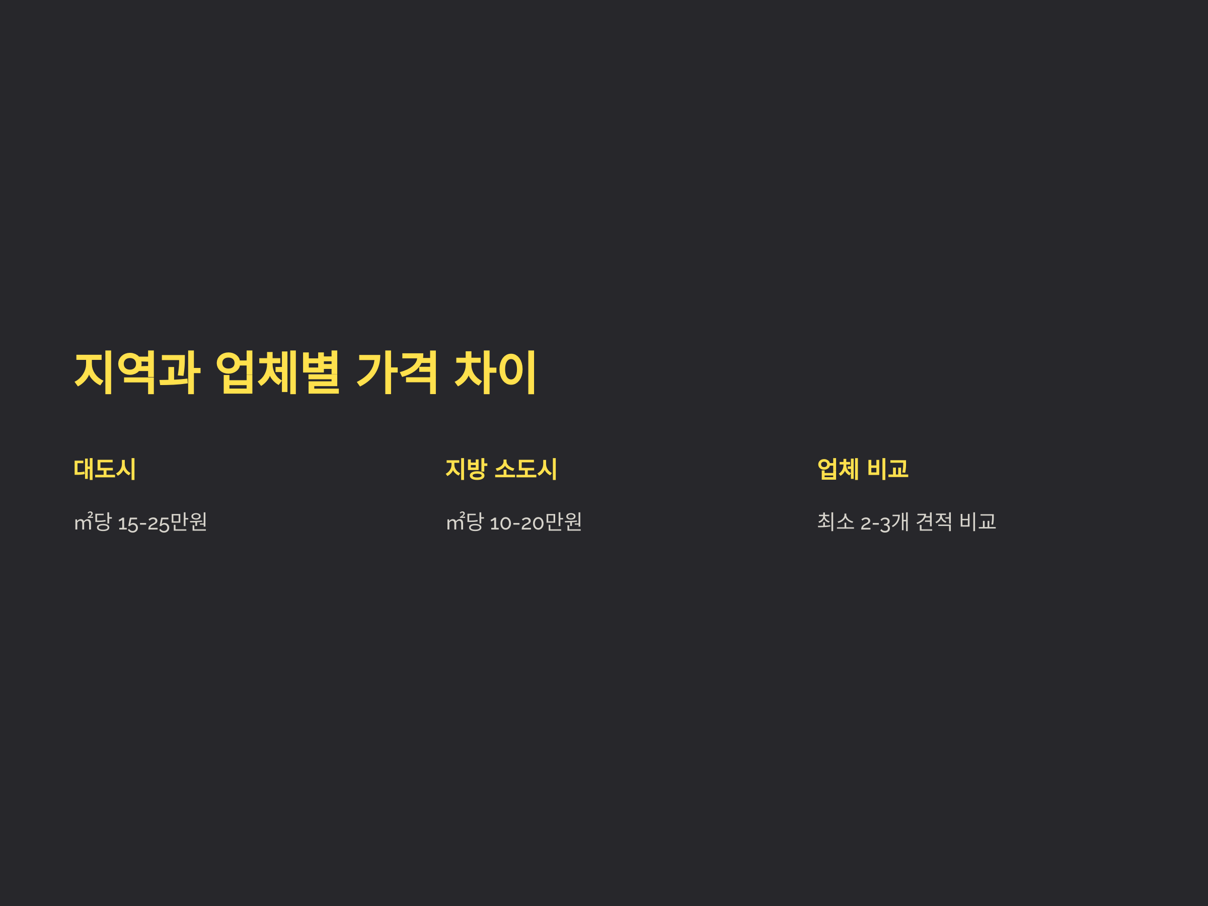 시공비용은 지역에 따라 차이가 날 수 있습니다. 대도시나 수도권에서는 공사비용이 상대적으로 높고, 지방에서는 비용이 조금 더 저렴할 수 있습니다. 또한, 시공업체마다 가격 차이가 존재하기 때문에, 여러 업체를 비교해보는 것이 좋습니다.