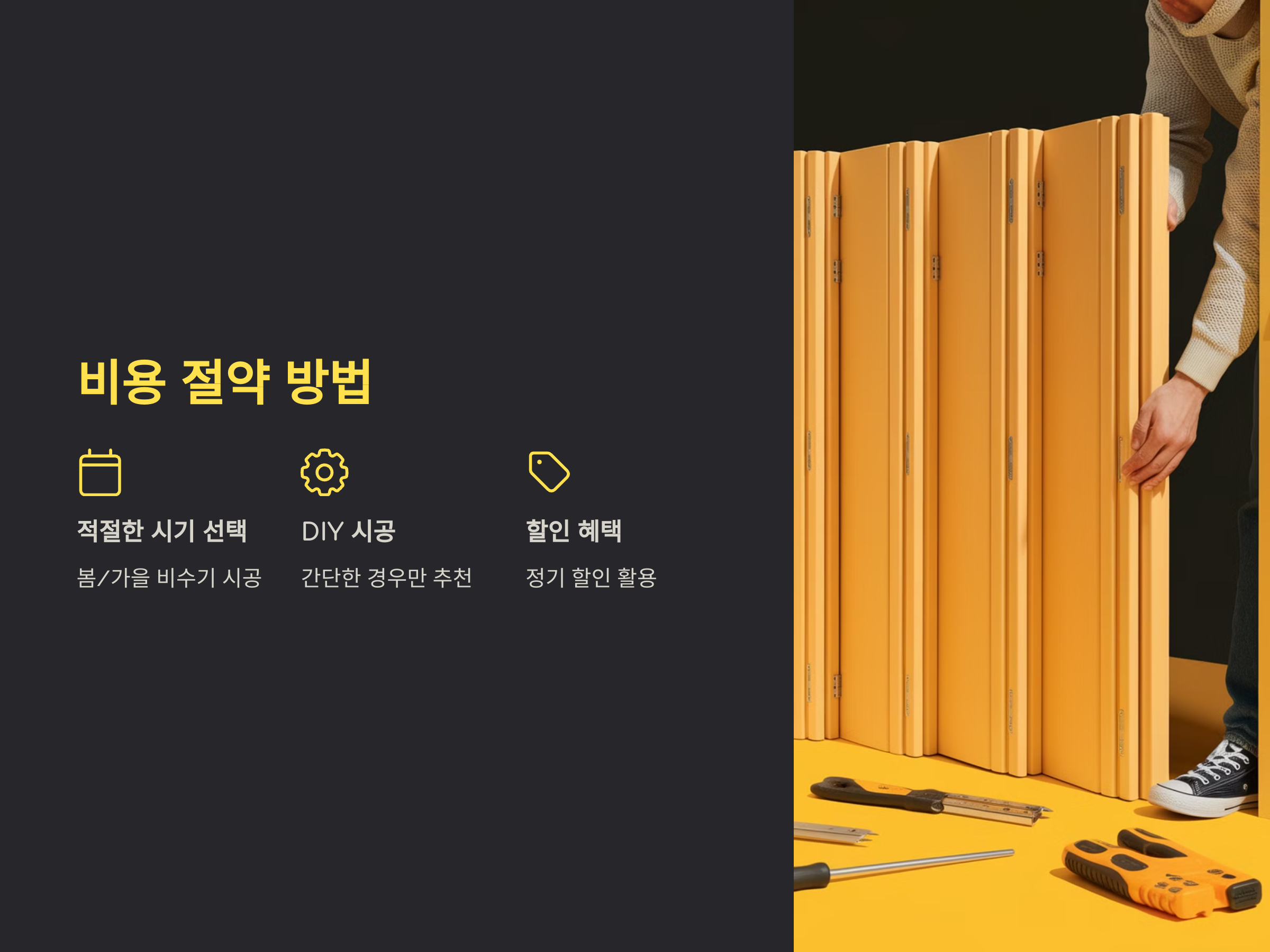 간단한 폴딩도어는 DIY 시공을 통해 비용을 절감할 수 있습니다. 그러나 전문가의 손길이 필요한 시공이라면, 무리하게 시도하지 말고 전문 업체에 의뢰하는 것이 안전합니다.