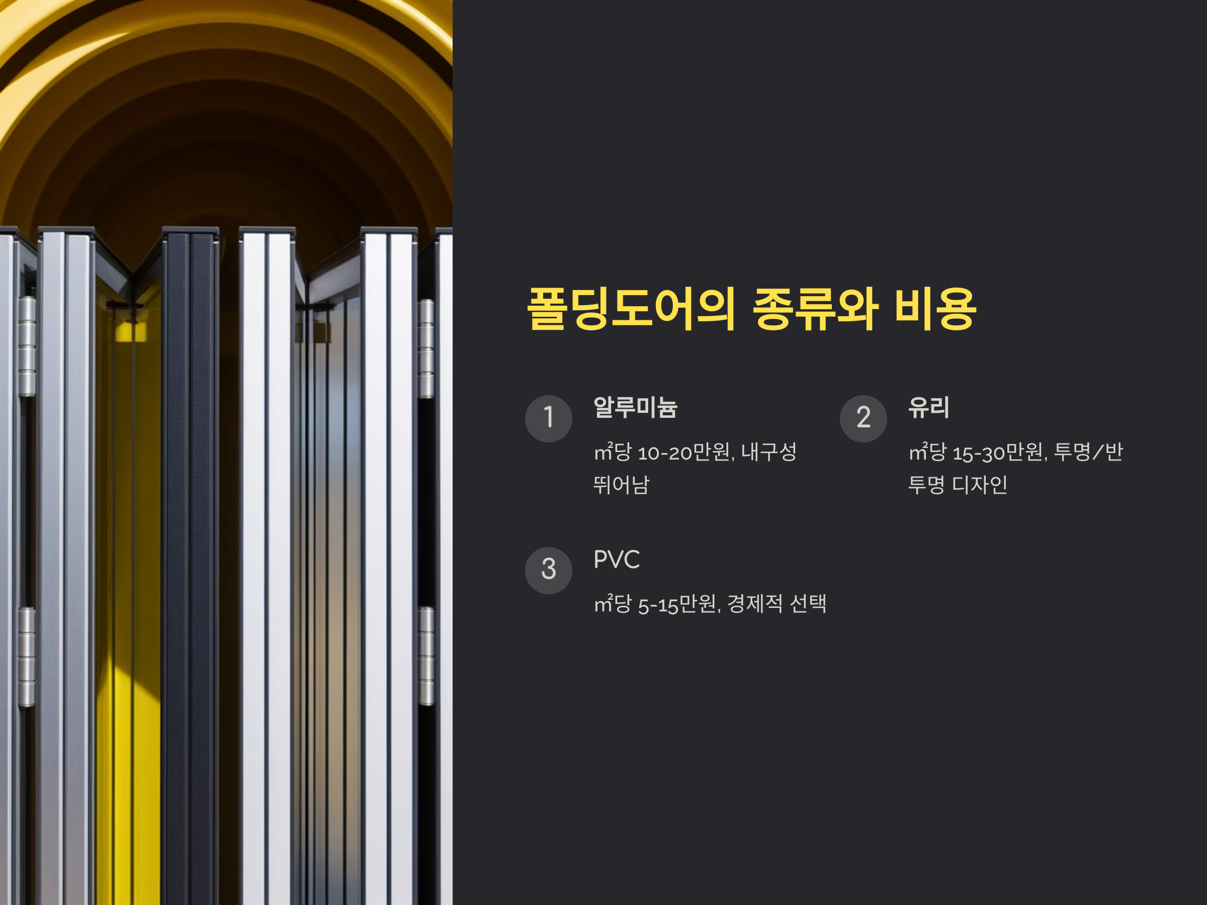 폴딩도어는 크게 알루미늄, 유리, PVC 등 다양한 재질로 제공됩니다. 각 재질의 특성에 따라 가격 차이가 나기 때문에, 자신이 원하는 스타일과 예산을 기준으로 선택하는 것이 중요합니다.