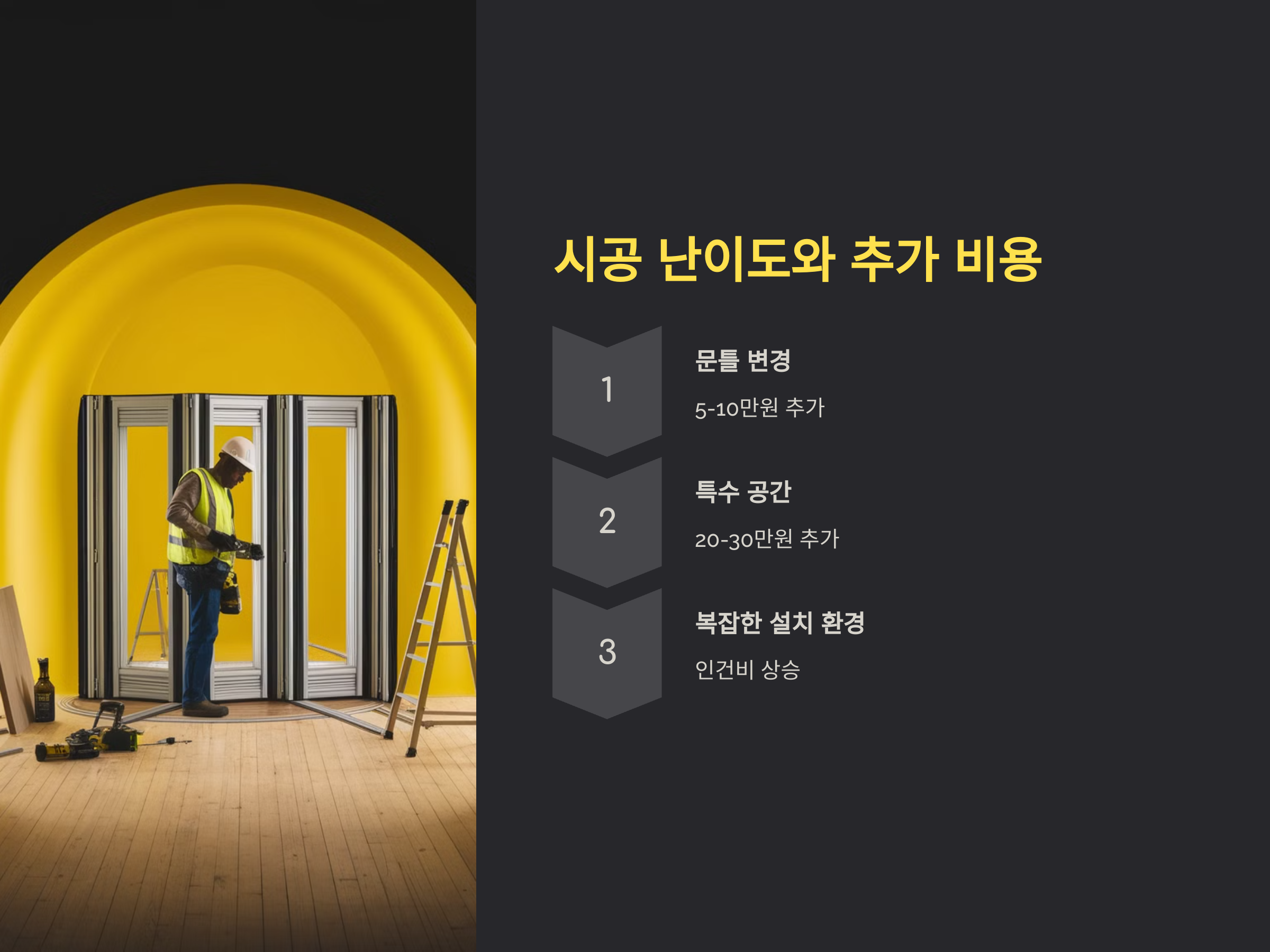 폴딩도어의 시공 비용은 시공 난이도에 따라서도 차이가 날 수 있습니다. 예를 들어, 문틀이 기존의 구조에 맞지 않거나, 추가적인 보강 작업이 필요한 경우 비용이 추가될 수 있습니다. 이 외에도 복잡한 설치 환경이나 특수한 공간에 설치할 경우 추가적인 인건비가 발생할 수 있기 때문에, 시공 전에 미리 확인하는 것이 중요합니다.