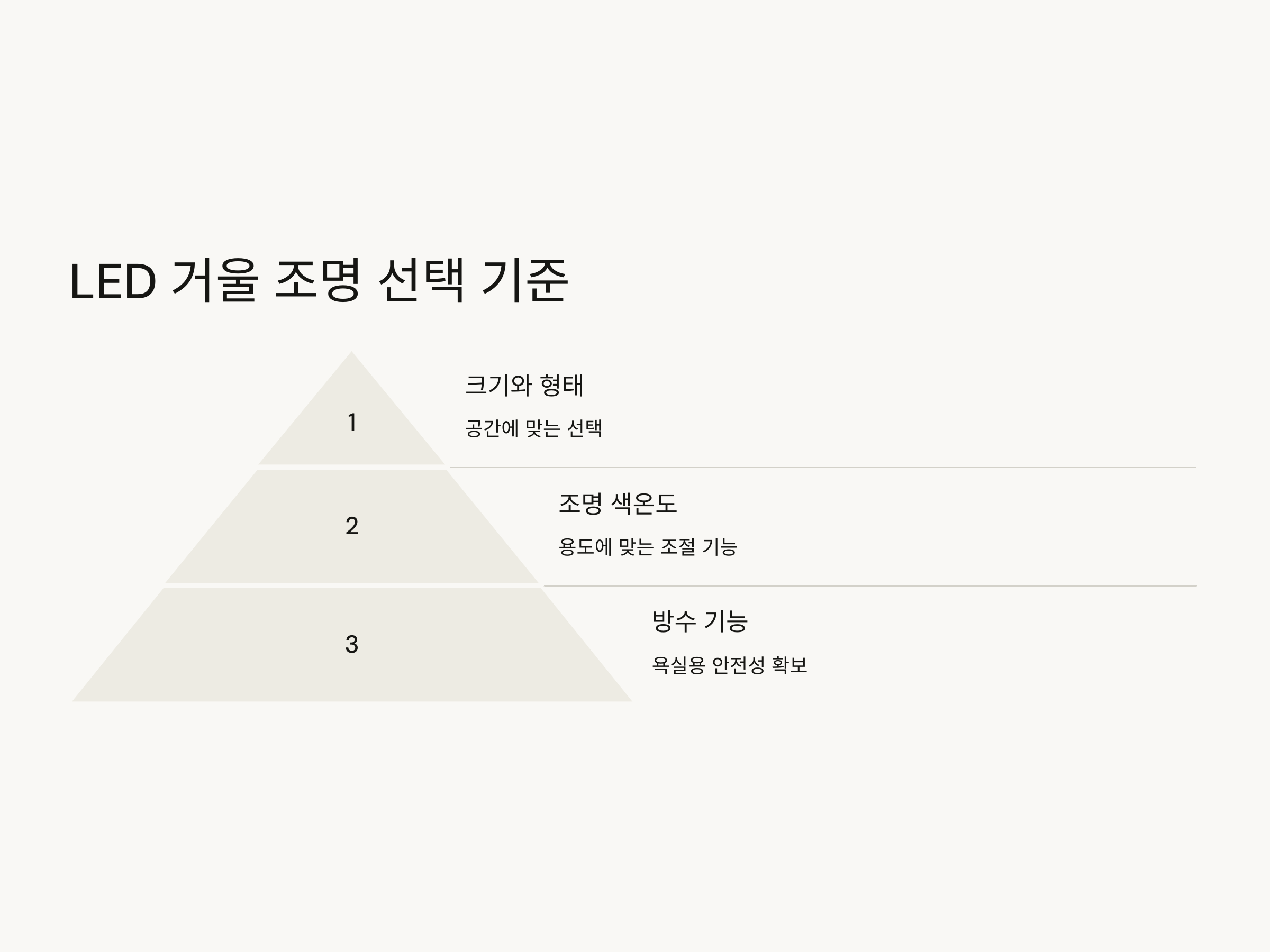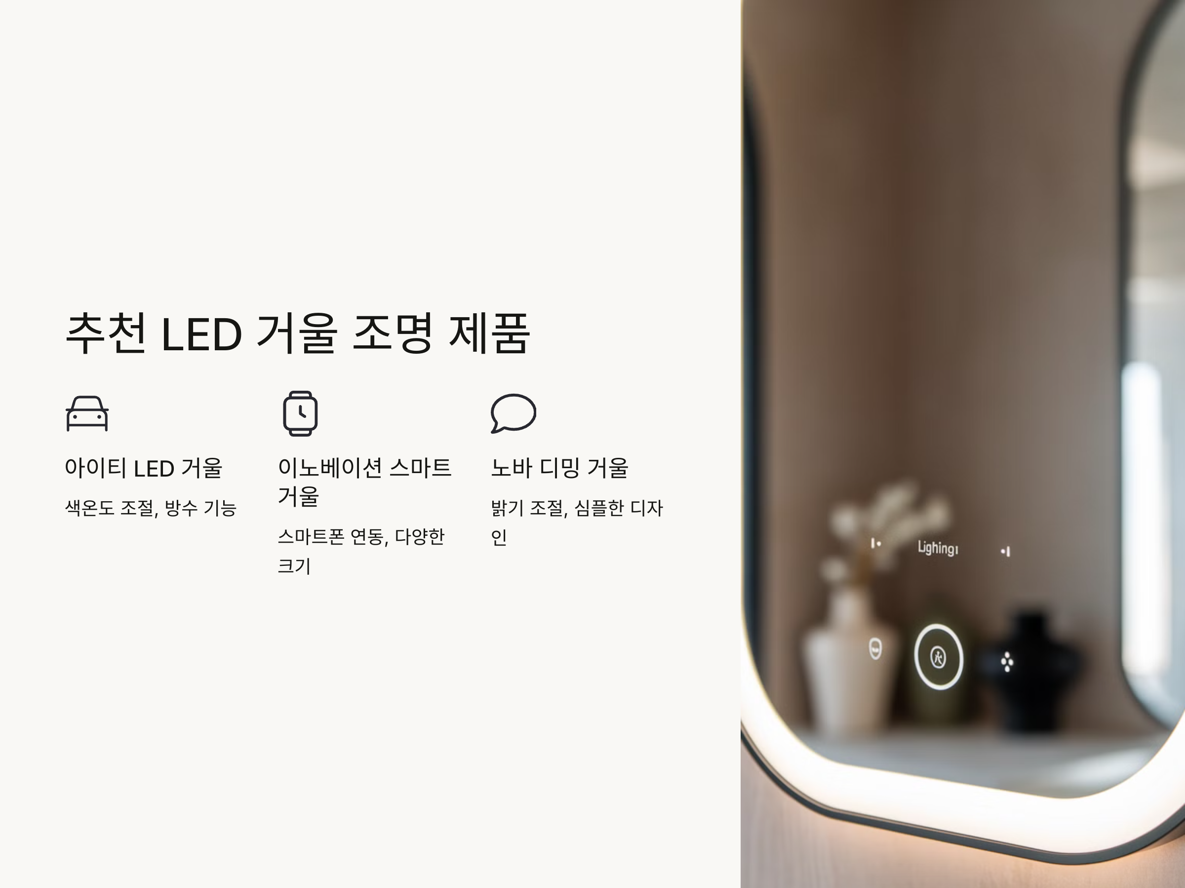 LED 거울 조명은 단순한 조명을 넘어 공간의 분위기를 바꿀 수 있는 중요한 아이템입니다. 적절한 제품을 선택하면, 기능성뿐만 아니라 집안의 미적 가치도 크게 향상시킬 수 있습니다. 자신에게 맞는 LED 거울 조명을 선택하여 공간을 더욱 세련되고 실용적으로 꾸며보세요. 색온도 조절 기능이 있는 제품이나 스마트폰과 연동되는 제품은 특히 추천할 만합니다.