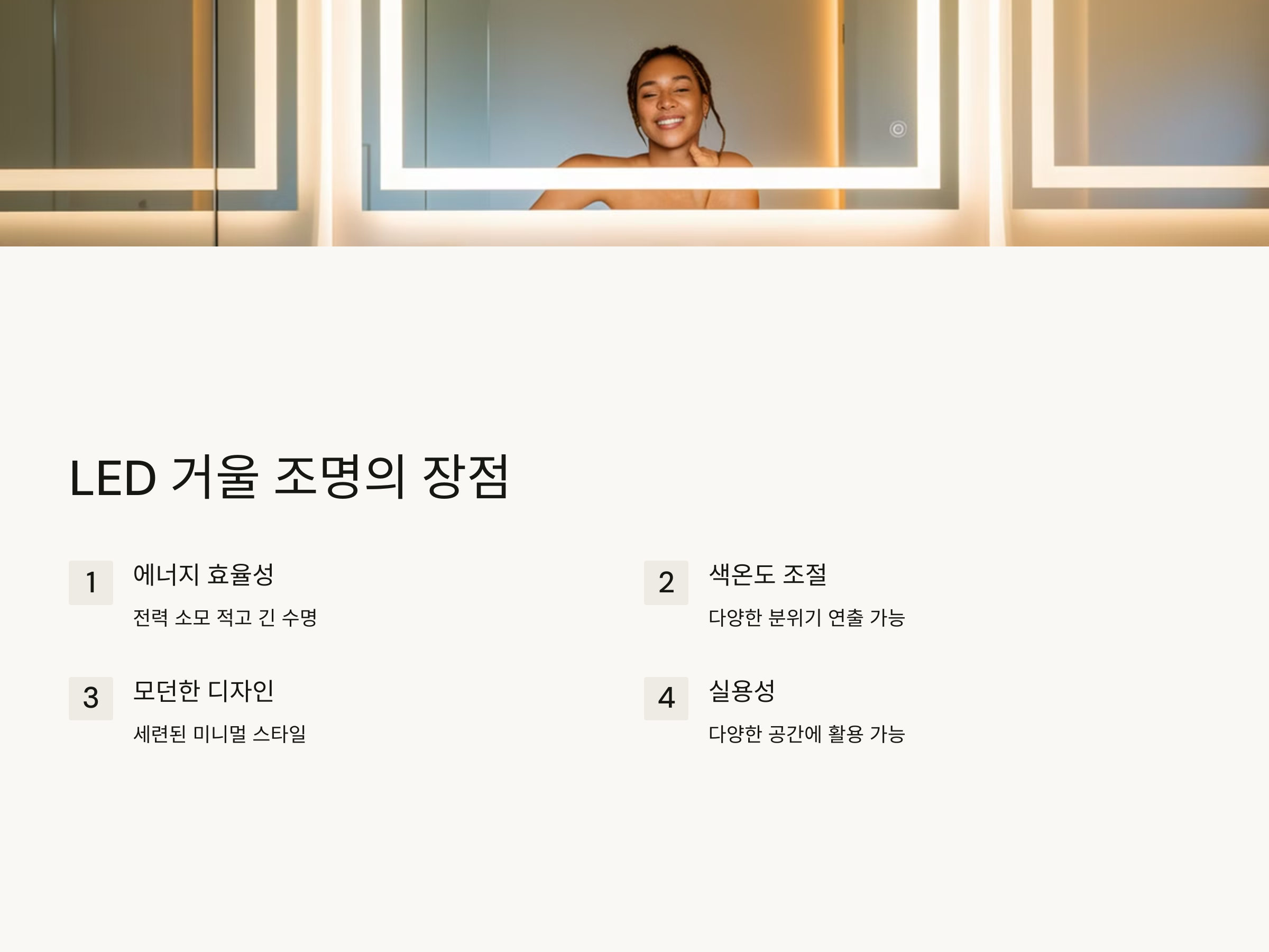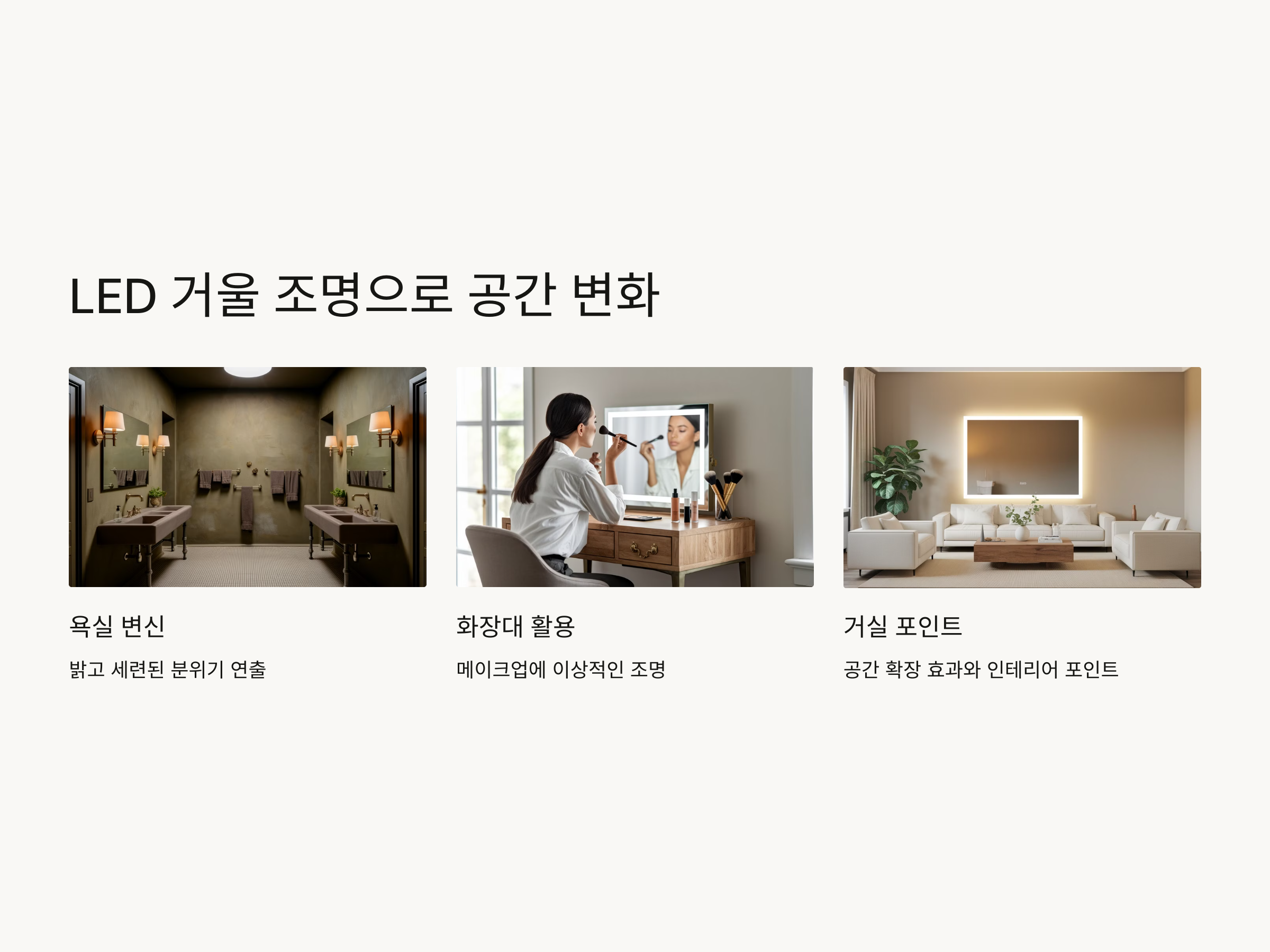 LED 거울 조명은 단순히 실용성을 넘어 집안의 분위기를 새롭게 변화시킬 수 있는 중요한 요소로 자리잡았습니다. 화장대나 욕실, 거실 등 다양한 공간에서 LED 거울 조명을 활용하면, 공간의 미적 가치뿐만 아니라 실용성도 높일 수 있습니다. 특히 LED 조명은 에너지 효율성이 뛰어나고, 다양한 색온도를 설정할 수 있어 어떤 분위기도 자유롭게 연출할 수 있다는 점에서 큰 인기를 얻고 있습니다.