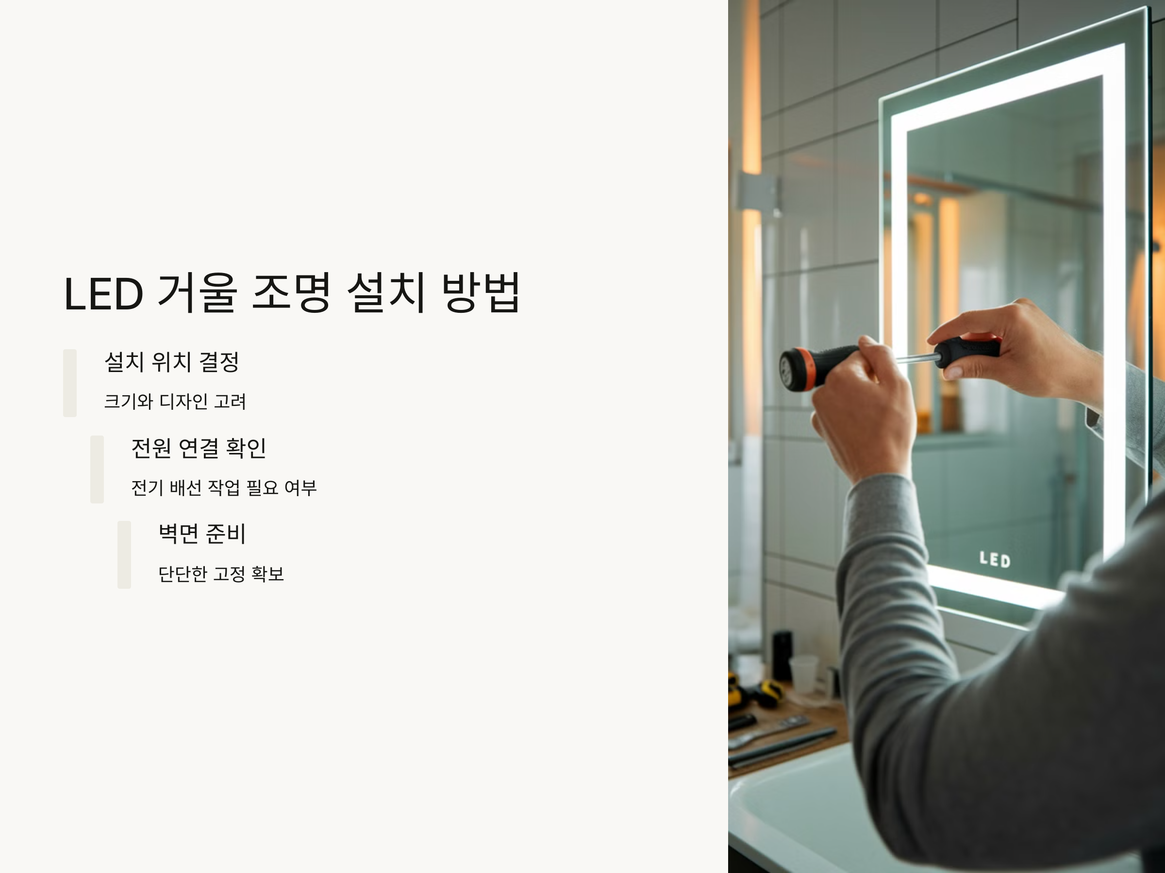 LED 거울 조명을 설치하는 방법은 비교적 간단하지만, 몇 가지 주의사항을 염두에 두고 진행하는 것이 중요합니다. 우선, 거울을 설치할 위치를 정확히 정한 후 전원 연결을 해야 합니다. 대부분의 LED 거울 조명은 벽에 부착하는 방식이므로, 벽면의 상태를 고려해야 합니다. 또한, 전기적인 연결이 필요할 수 있으므로, 전기 전문가에게 의뢰하거나 직접 설치하는 경우 전선 연결을 안전하게 해야 합니다.