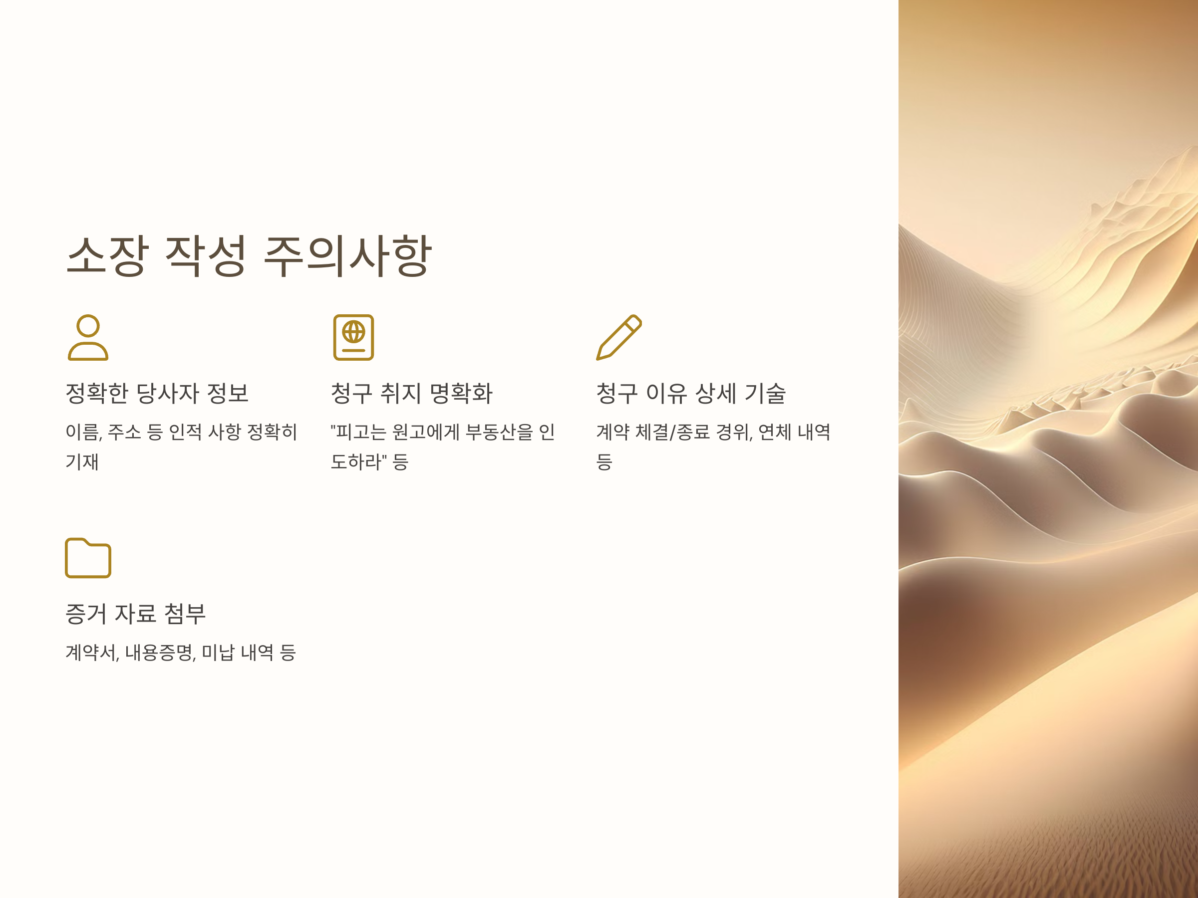 - 청구 취지 명확히 작성: 예를 들어, "피고는 원고에게 별지 목록 기재 부동산을 인도하라."와 같이 명확하게 작성해야 합니다.