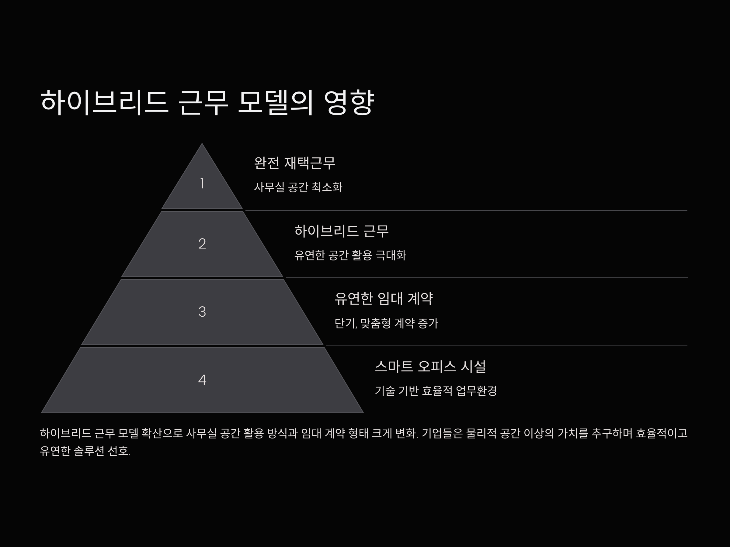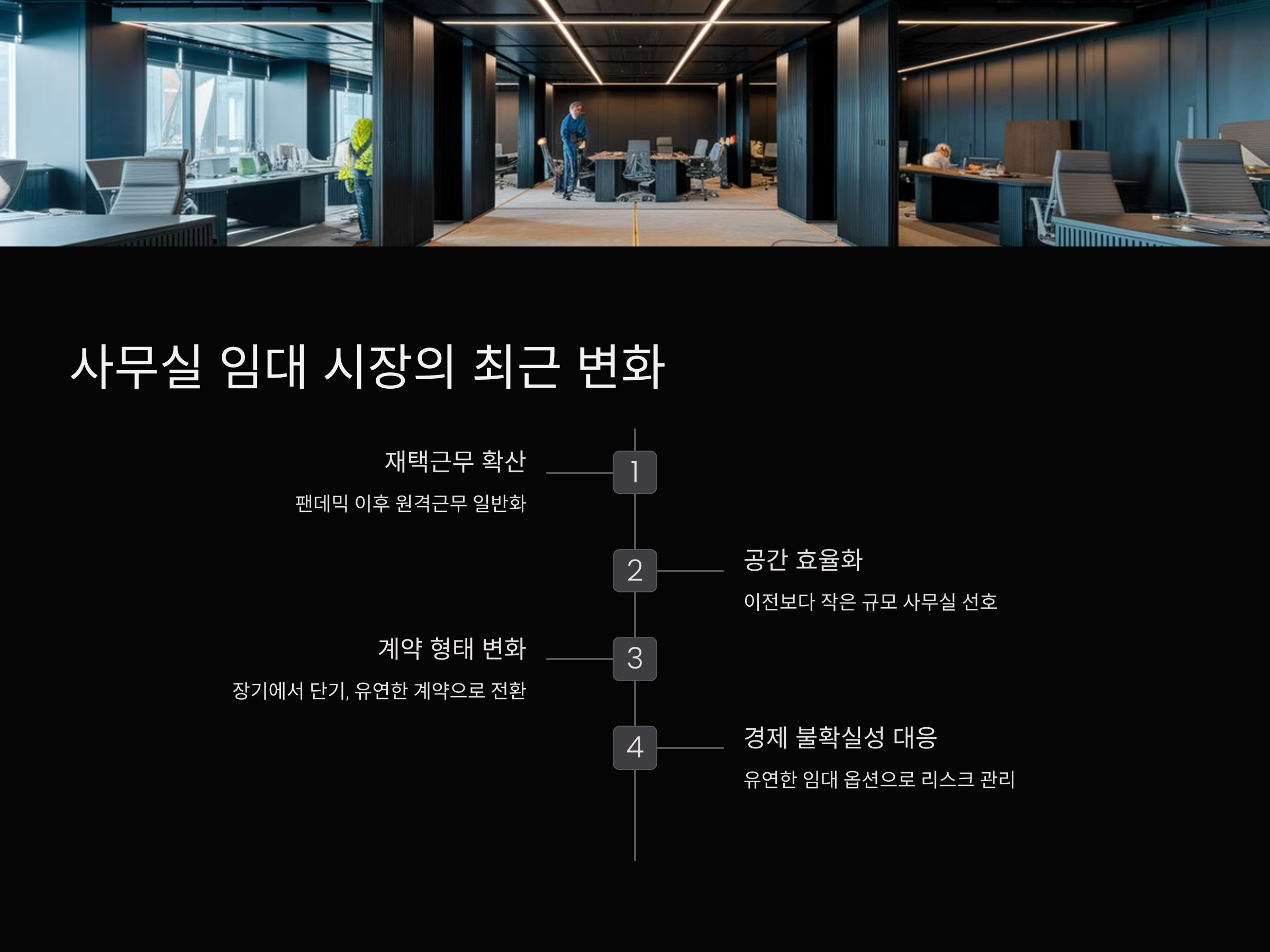 하지만 현재는 경제 회복과 함께 많은 기업들이 다시 오프라인 업무로 복귀하고 있으며, 이에 따라 사무실 수요가 점차 증가하고 있습니다. 특히, 하이브리드 근무 모델이 일반화되면서, 기업들은 보다 효율적인 공간 활용과 유연한 계약을 요구하고 있습니다. 이러한 변화는 앞으로도 계속될 것으로 보이며, 사무실 임대 시장은 점차 더 유연하고 다양해질 것입니다.