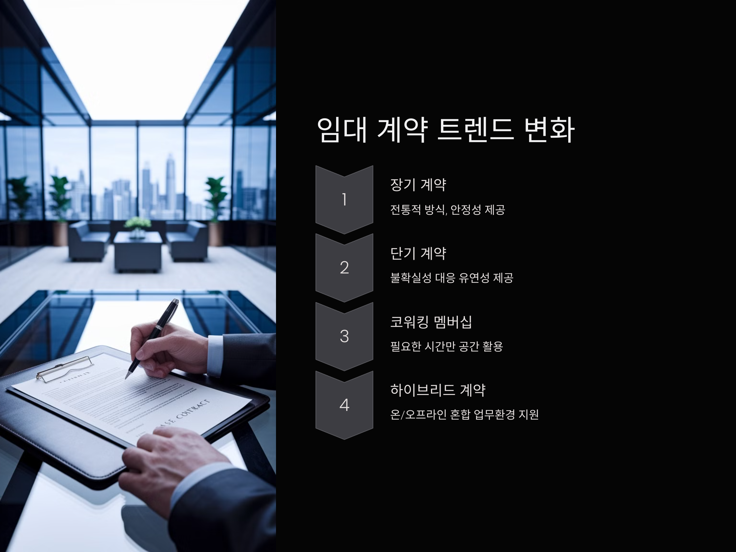 사무실 임대 계약의 트렌드는 빠르게 변하고 있습니다. 특히 기업들이 선호하는 계약 형태가 다변화되고 있습니다. 이전에는 장기 계약이 일반적이었지만, 최근에는 단기 계약을 선호하는 경향이 커지고 있습니다. 이는 기업들이 불확실한 경제 상황에 맞춰 유연하게 대처할 수 있도록 해주기 때문입니다.