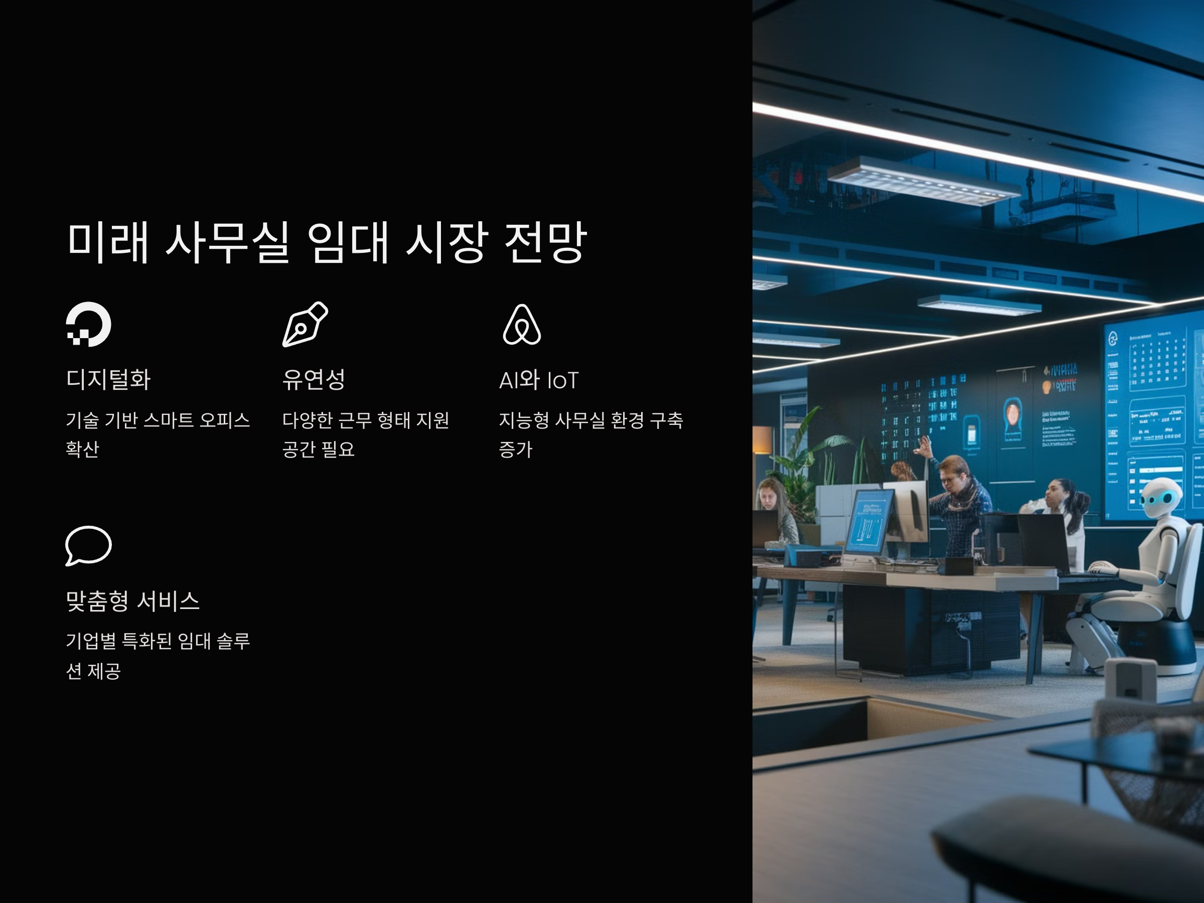 향후 사무실 임대 시장은 디지털화와 유연성의 두 가지 트렌드를 중심으로 변화할 것으로 예상됩니다. 하이브리드 근무 모델이 확산되면서, 기업들은 사무실을 물리적 공간만으로 생각하지 않고, 다양한 기술과 인프라를 고려한 공간을 필요로 합니다. 또한, AI와 IoT 기술이 적용된 스마트 오피스가 대세로 자리 잡을 것입니다. 이는 기업들에게 더욱 효율적인 업무 환경을 제공할 것으로 기대됩니다.