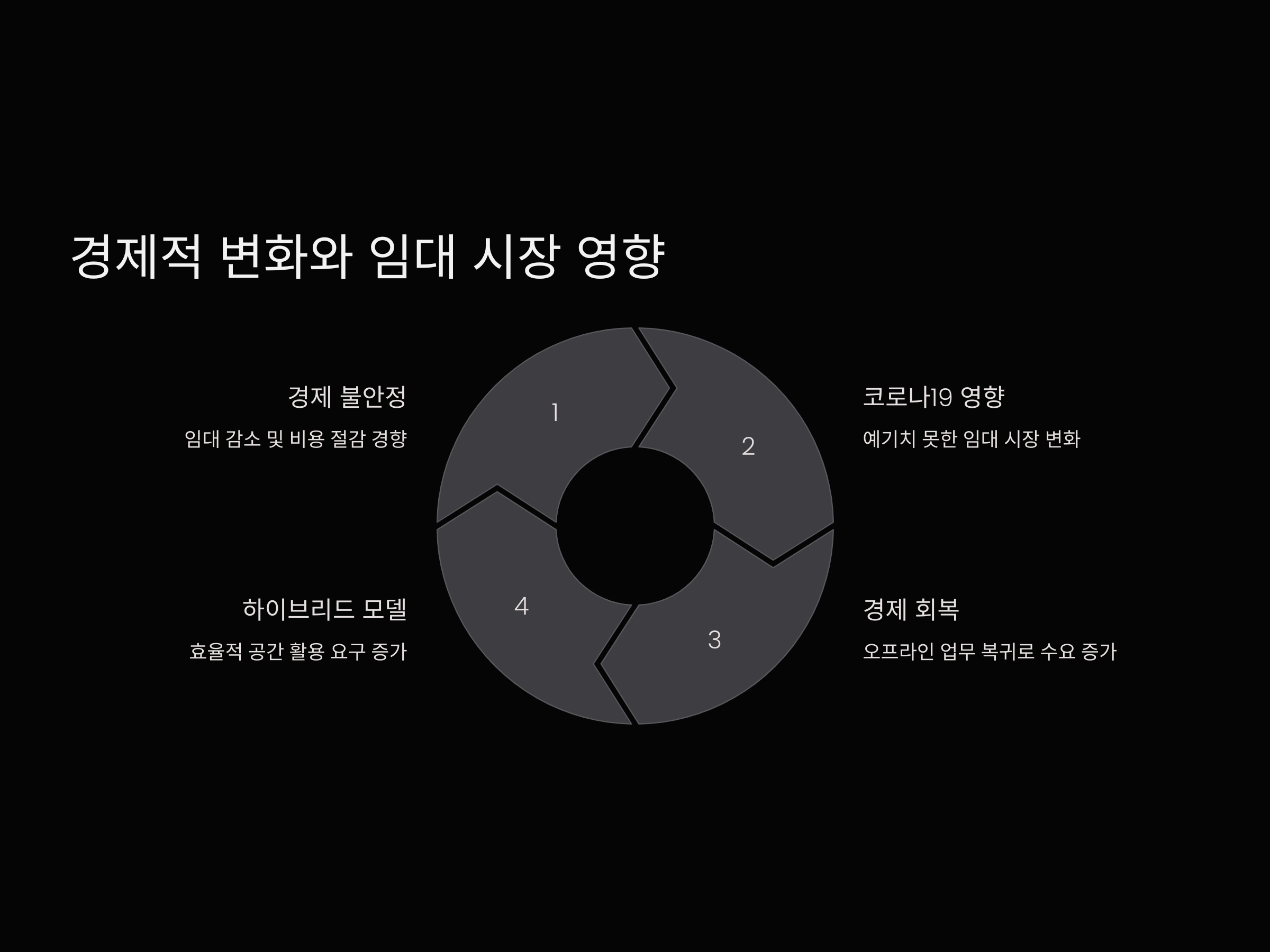 사무실 임대 시장은 단기적인 경제 변화에 민감하게 반응합니다. 경제가 불안정할 때, 기업들은 사무실 임대를 줄이고 비용을 절감하려는 경향이 있습니다. 특히 코로나19 팬데믹처럼 예기치 못한 사건이 발생하면, 임대 시장은 큰 영향을 받습니다.
