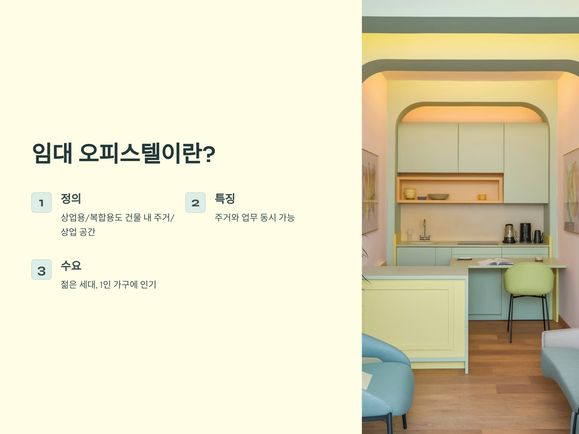 임대 오피스텔은 상업용 건물이나 복합 용도 건물 내에 있는 주거용 또는 상업용 공간을 임대하는 부동산입니다. 일반적인 오피스와 달리, 주거와 업무를 동시에 할 수 있는 공간을 제공하기 때문에 소형 주택을 찾는 젊은 세대나 1인 가구에게 인기가 높습니다. 이로 인해 임대 시장에서 높은 수요를 보이고 있습니다.